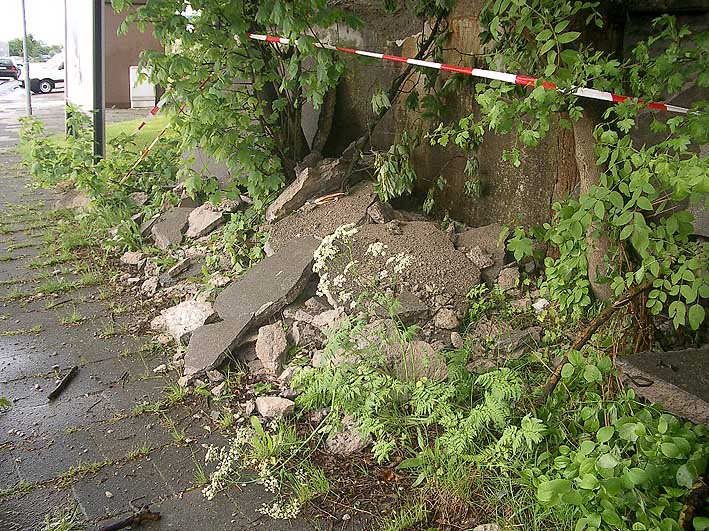 24.05.06: In nur drei Tagen wurde ab Montag bis heute fast der gesamte noch vorhandene Rest des betonierten Deckungsgrabens zerkleinert. Zwei Betonbrockenberge des anfallenden Schuttes sind inzwischen aufgetürmt. Nach den zögerlichen ersten Abrisswochen kann man sagen, dass nun "ganze Arbeit" geleistet wurde. Man sieht wieder einmal, es lag wohl doch nicht an der Technik sondern an anderen "Hürden". Vielleicht war diese Abrissdauer auch geplant. Jedenfalls wird in einigen wenigen Etappen wohl (über Erdgleiche) nichts mehr an den Graben erinnern.