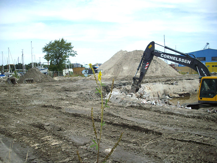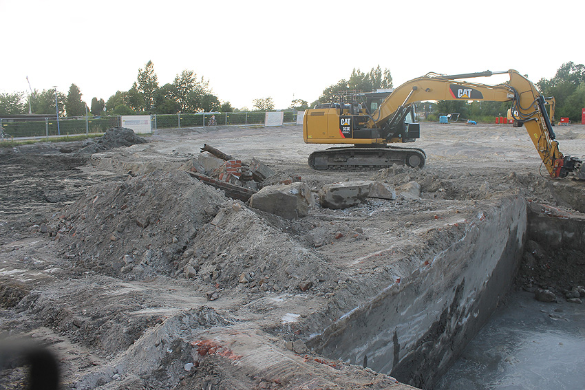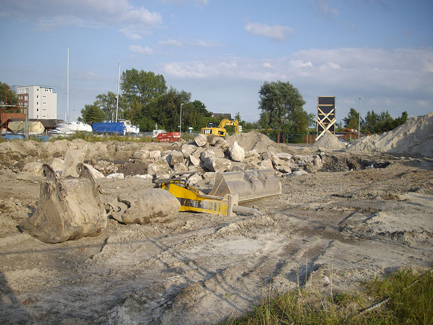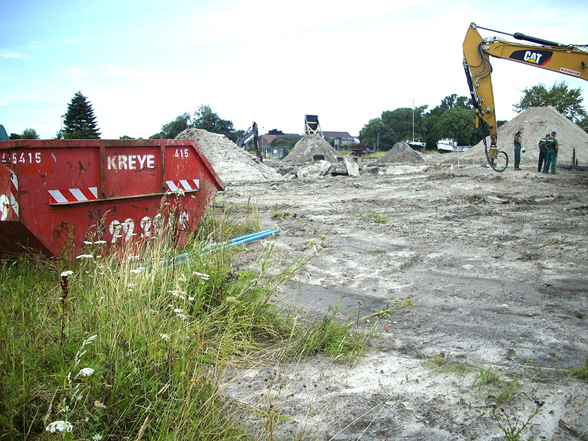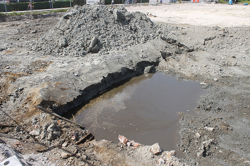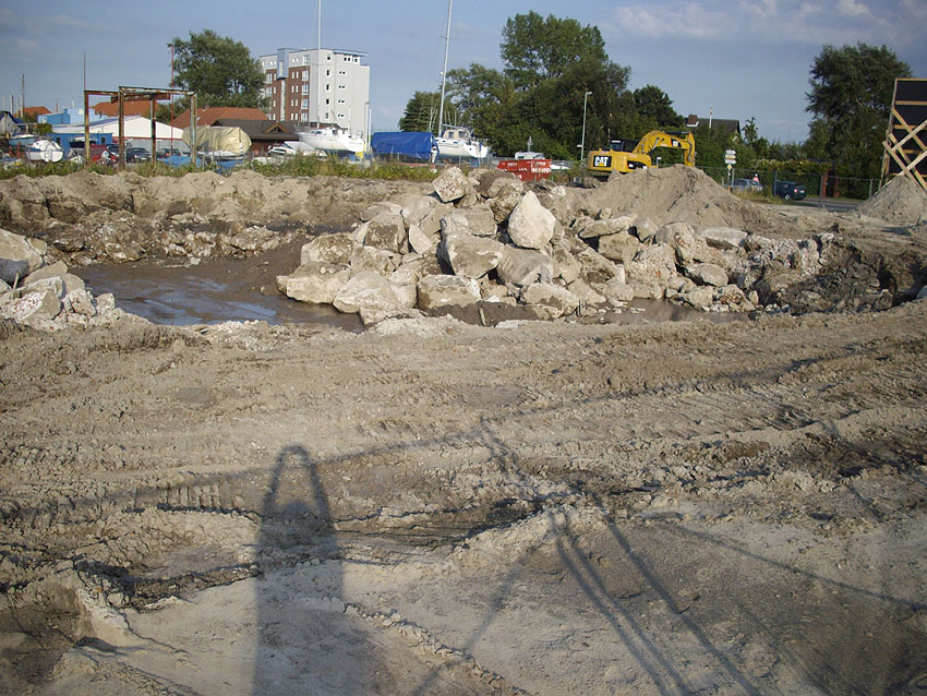 Die Sohle des dortigen ehemaligen Tanks dürfte nicht beseitigt worden sein. Durch die dünne Betonschicht, die nun wieder mit Sand und Schlick überdeckt ist, wird scheinbar hindurchgerammt. Damit endet unsere Dokumentation von dieser Ecke der Stadt.