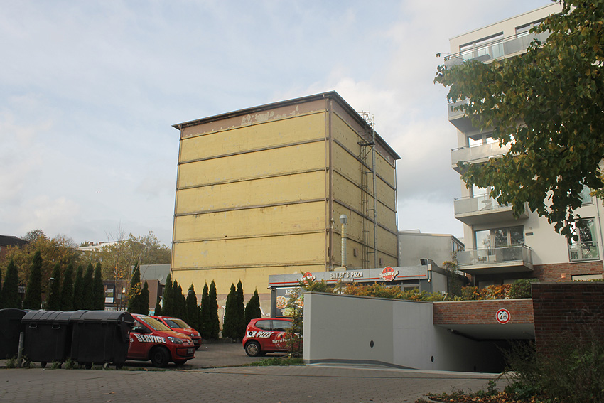 Ein anliegendes Gebäude, welches auf die Reste eines im Krieg teilzerbombten Wohnhauses errichtet wurde, ist vor einiger Zeit abgerissen worden. Zu sehen in der Abrissgrube noch Teile der massiven Kelleraußenwände. Eventuell befanden sich hier Luftschutzkeller.