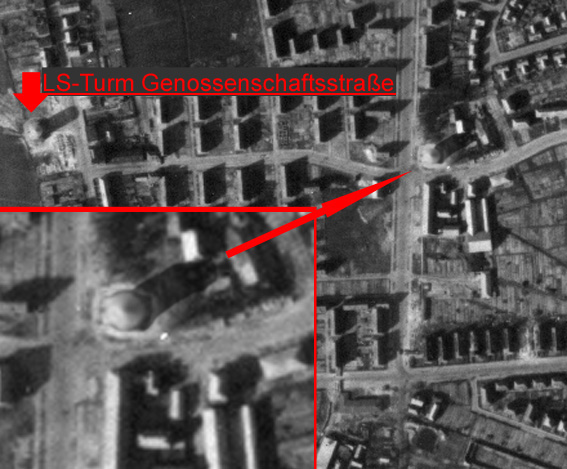 Der Standort heute. Das helle Gebäude steht direkt auf dem Bunkerfundamentbereich.