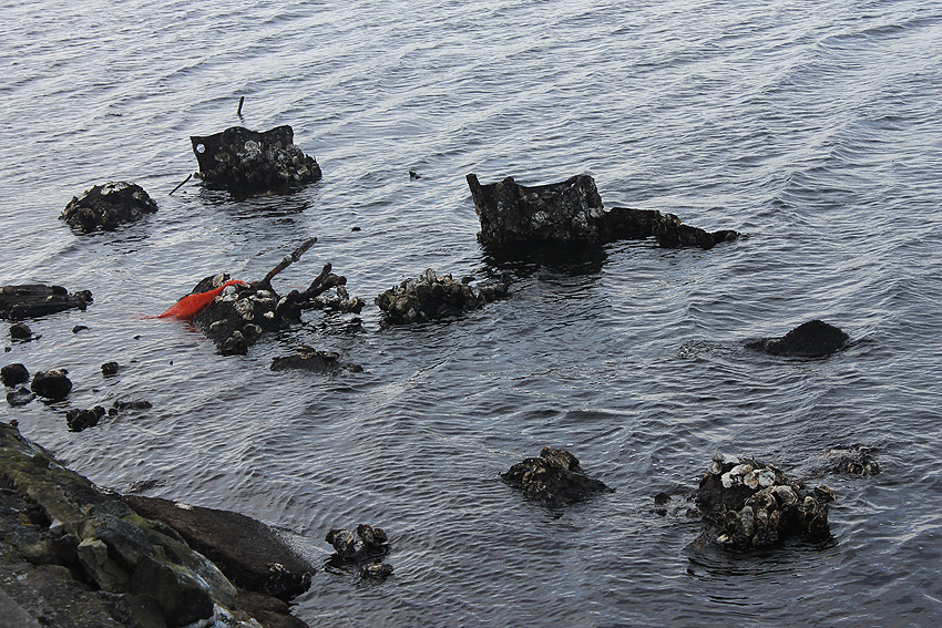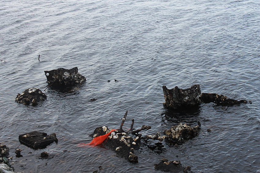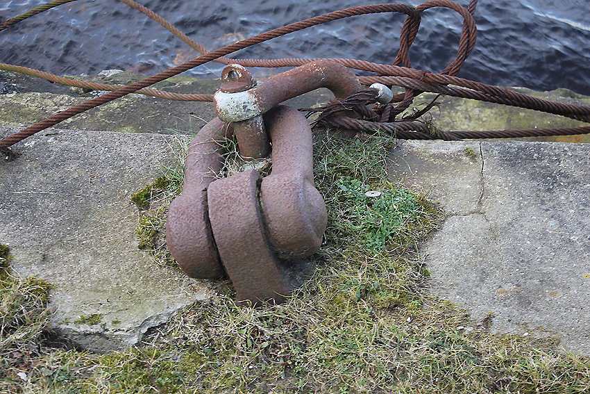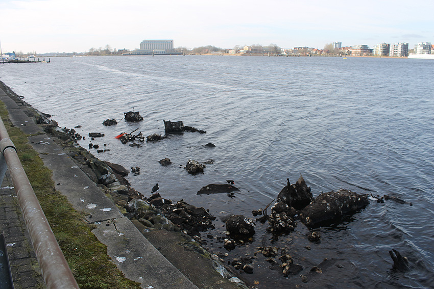 Trümmerstücke der alten Kaimauerbefestigungen / hier war das Westende der 1945 noch existenten Bereiche der Seydlitzbrücke. Eventuell auch einige durch Sprengung hierhin katapultierte Reste vom Bunker, direkt nördlich am Ufer des Hafens. Kurzzeitig im Sommer 2010 erkennbar, da der Hafenwasserstand um circa einen Meter abgesenkt wurde. Leichtsinniges Baden ist hier nicht zu empfehlen...
