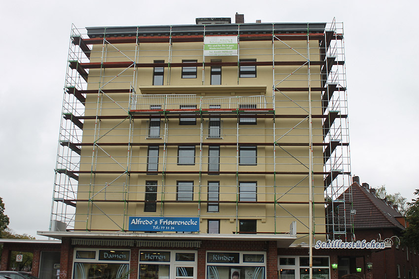 30. August 2019: Es tut sich nun wieder was. Der gesamte Bunker ist eingerüstet und Fassadenarbeiten schreiten voran.