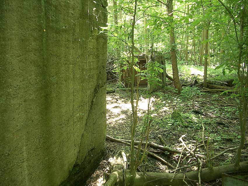 Der Bunker lag ursprünglich direkt östlich an einem der großen Munitionslagerbunker, welche teilweise schon im Krieg durch Bombeneinwirkung mit folgender Munitionsselbstsprengung zerstört worden sind. Links des roten Quadrates sieht man die Fundamentreste eines solchen Bunkers. Siehe auch Hier.