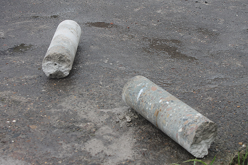 Stand 25.05.18: Die Neubauaktivität auf dem Gelände hat in den letzten Tagen nun (endlich) begonnen. Die Bunkerplatte dient jetzt als Fundament für Klohäuschen. Eine Kernbohrung wurde gesetzt. Drei Stücke dieser Bohrung liegen nun auf der Platte. Es ergibt sich eine Tiefe der Bodenplatte von etwas mehr als einem Meter. Der Abriss des Reliktes dürfte nicht mehr fern sein. Wir berichten weiter.