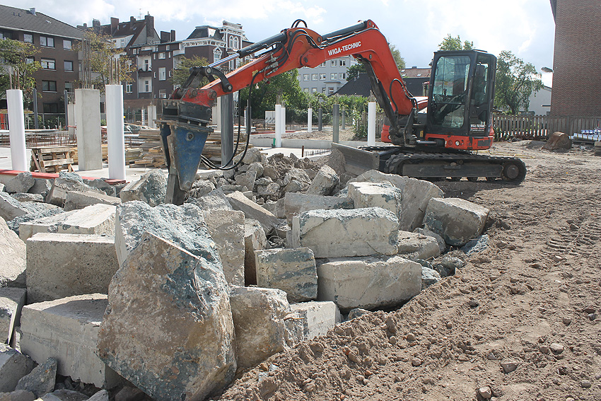 Stand 29.07.18: Wider Erwarten dürfte die Bunkerplatte glücklicherweise doch erhalten bleiben. Sie wurde lediglich im Südostbereich zusätzlich zu den damaligen Abbruchbereichen noch ein kleines Stück abgefräst. Der Neubau wird dort dann direkt an die Platte grenzen. Wir berichten weiter.