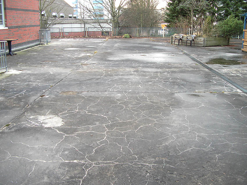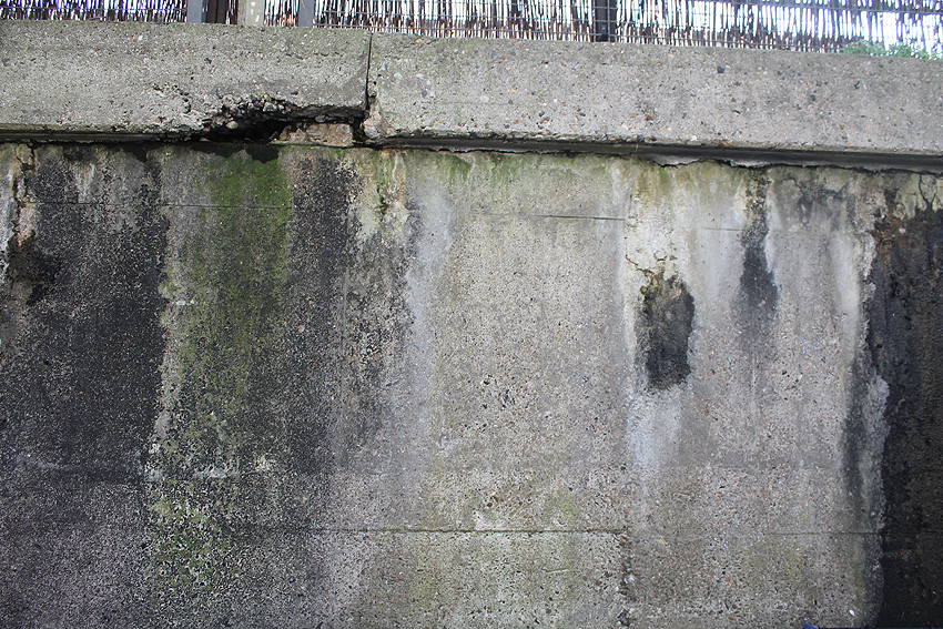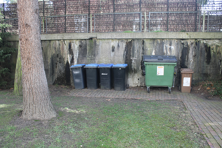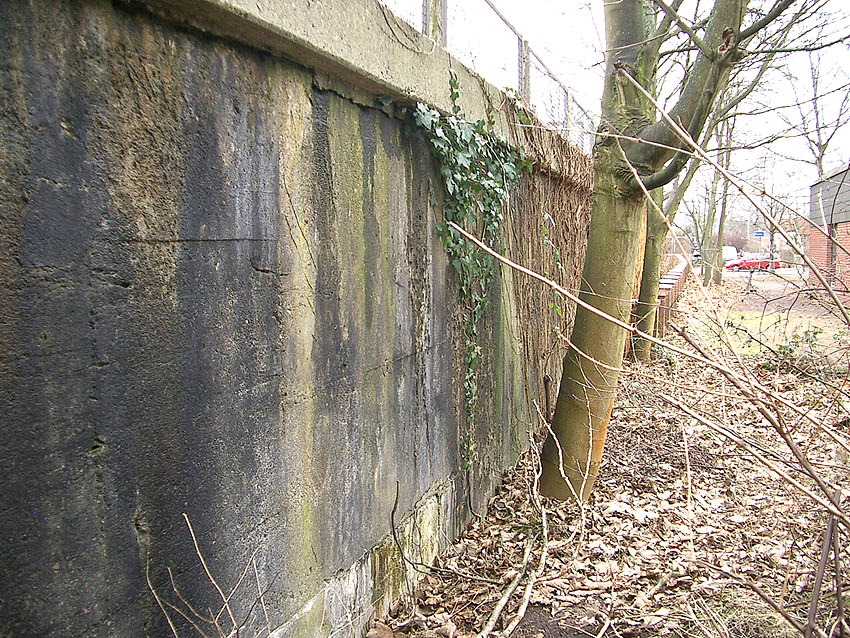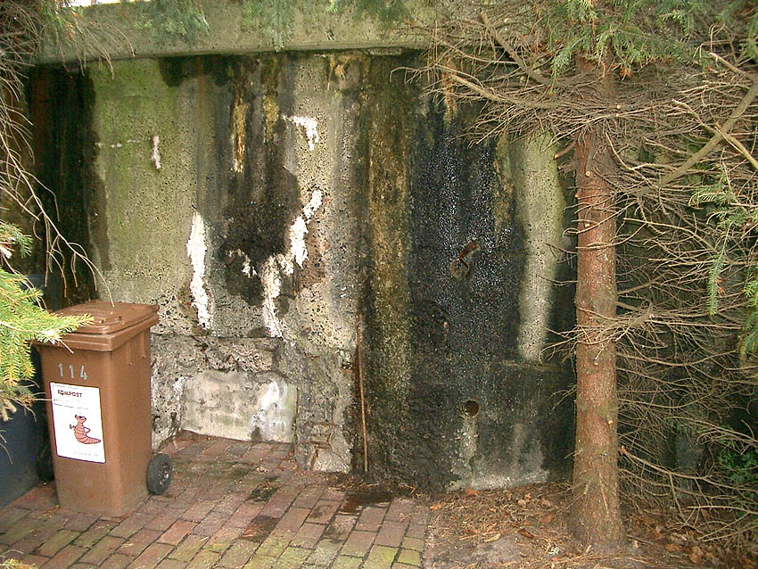 Die weisse Wand links gehört zum unmittelbar neben dem Bunker befindlichen umgebauten Hochbunker Rheinstraße 114.
