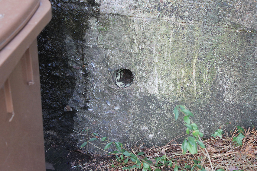 Rings um den versiegelten Öffnungsbereich sind mehrere "Löcher" vorhanden. Links davon auch ein größerer Schacht (Luftschacht). Die kleineren "Löcher" könnten für die Platzierung von Sprengmaterial eingebohrt worden sein. Sollte hier massiv gesprengt werden? Sollte eventuell nach dem Krieg ein größerer Zugang geschaffen werden?