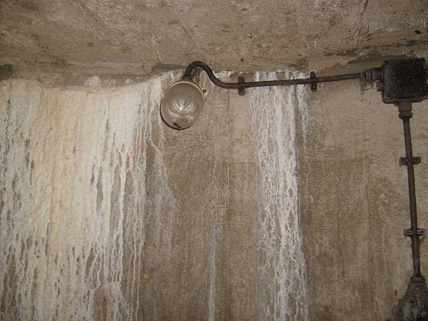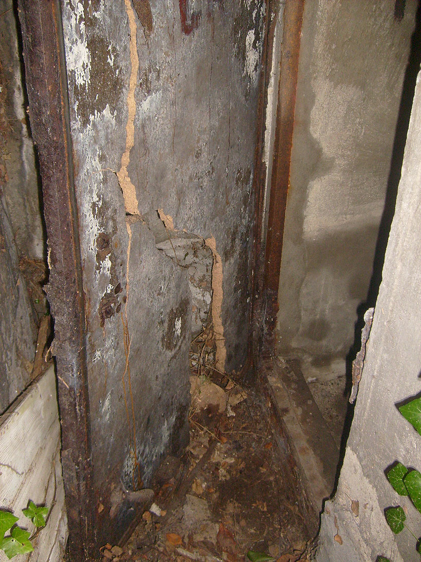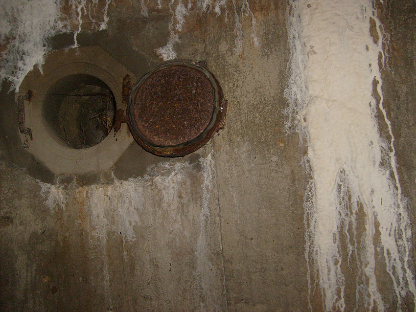Die Tür besteht (wie bei vielen weiteren Oldenburger Rundschutzbauten) aus dem gleichen beton-artigen Verbundmaterial (eine härtere Version ähnlicher Zusammensetzung wie die heutige Gipsverbundplatte), wie z.B. jene Türen in den Gasschleusen der Wilhelmshavener Kriegsmarine-Truppenbunker gefertigt wurden. Stahl war bereits Mangelware. - Dieses Material, das ursprünglich extrem belastungsfähig war, ist günstiger / leichter zu beschaffen bzw. herzustellen gewesen.