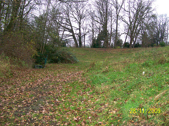 LS-Hangstollen Bellevue, eventuell mit zwei Eingängen, von denen auch der zweite mutmaßlich einige Meter weiter noch existiert (Bild mit Pfeil).