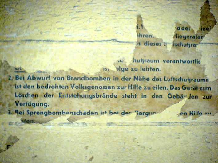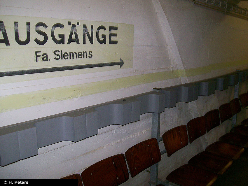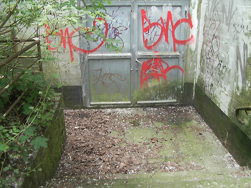 Der auf dem oberen Bild erkennbare Eingang ist intakt - es führt eine Treppe ca. 20 Stufen hinab, unten steht das Wasser knietief. Dann folgt eine Mauer, diese ist nur 1,2 - 1,3 m hoch, der Rest steht unter Wasser. Die Mauer hat ein großes, rechteckiges Loch in der Mitte. Es ist noch die Aufschrift "Zu den Schutzräumen" zu erkennen. Es gibt noch 3 weitere Eingangsbauwerke, diese sind verklinkert. Eines ist von der Straße aus zugänglich, allerdings ist es zugemauert worden: