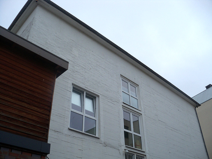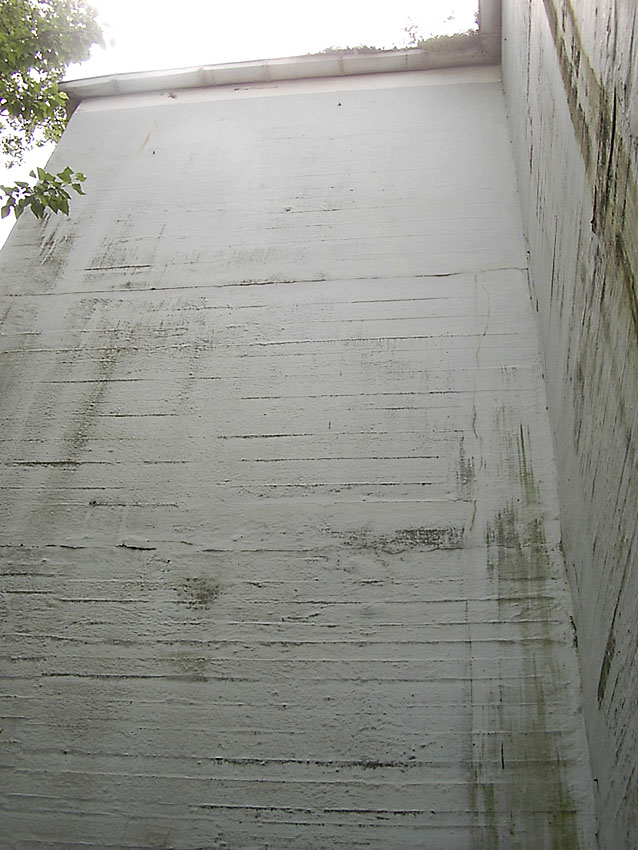 Die Bauform des herausragenden Betons und die Verklinkerung sind ähnlich der Erscheinung des anderen zugemauerten Einganges, welcher von der Straße aus sichtbar ist.