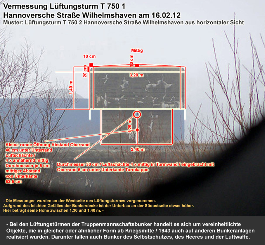 Anmerkung: Ab 1943 wurde der Truppenbunkerlüftungsturm als Standardbau in identischer oder leicht abgewandter Weise auch auf anderen Bunkern realisiert. Beispiele hierfür sind der Bunker im Kieler Schloss