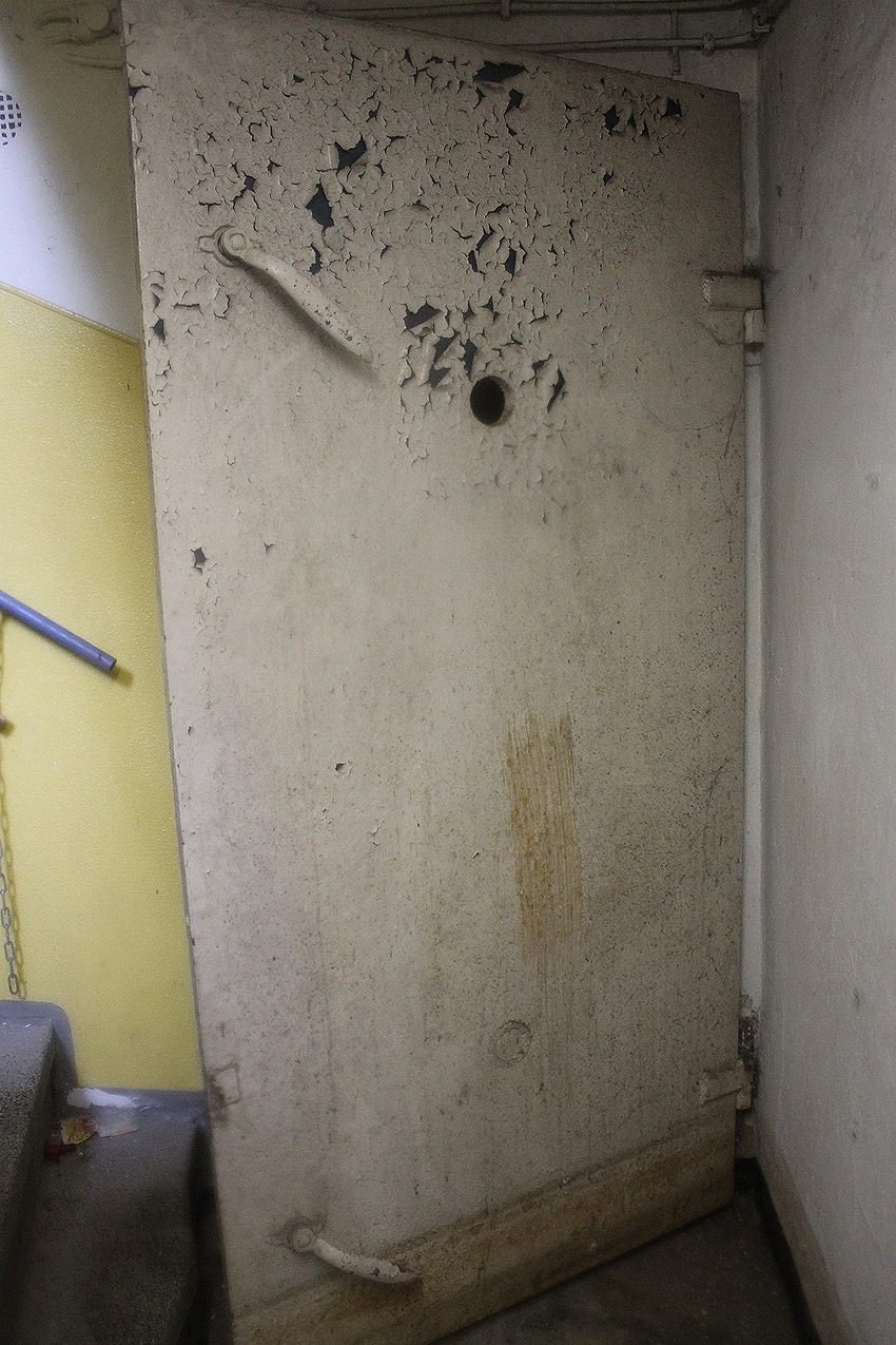 Heutiger Bestand (Stand September 2017): Neben dem in der Aufnahme erkennbaren Schriftfeld ein Soll-Mauerdurchbruch zwischen beiden Häusern und zwei noch vorhandene Druckschutztüren.