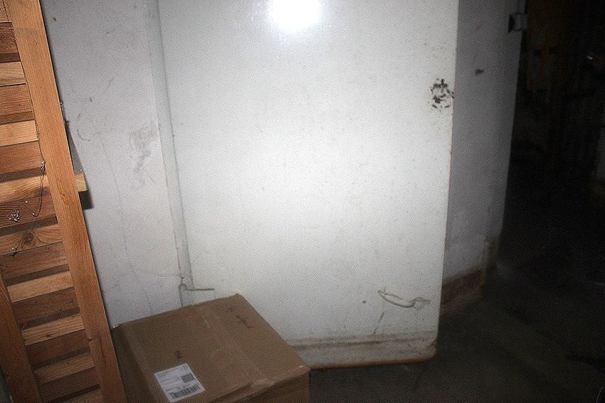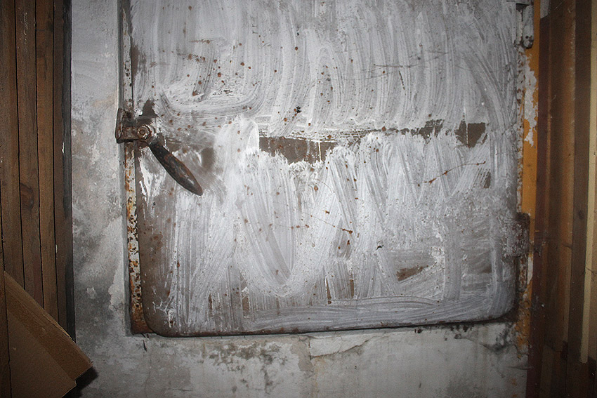 Verschlossene Tür / dahinter äußerlich am Kellerfenster angebrachte Stahlklappe: