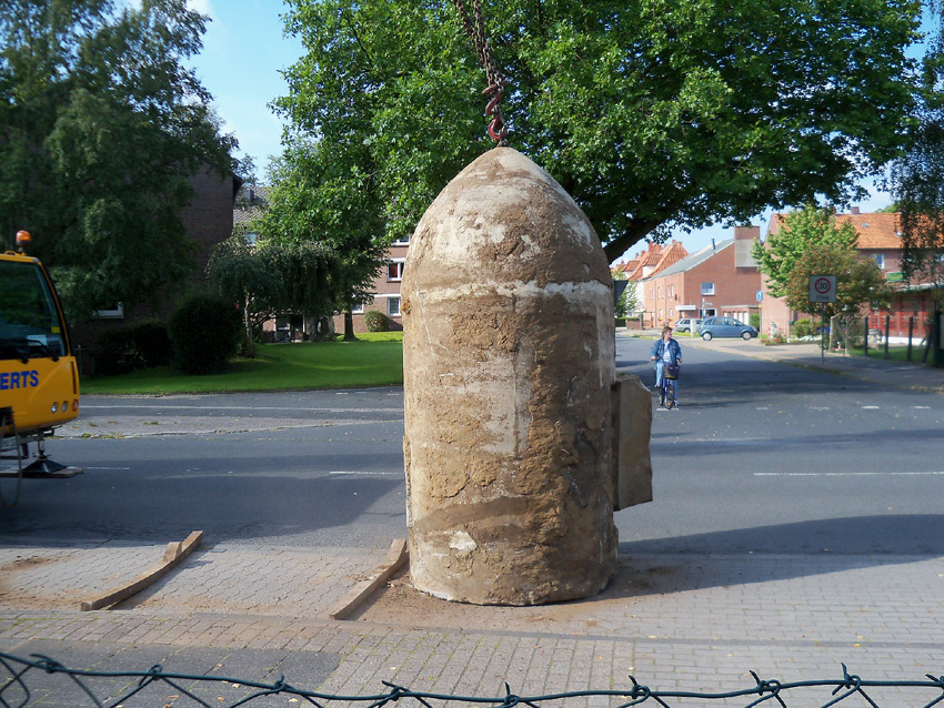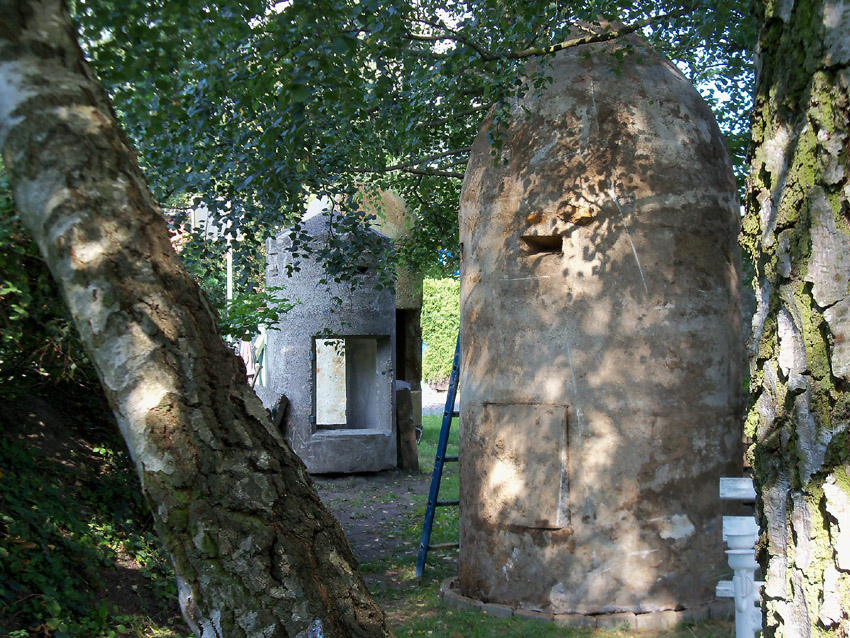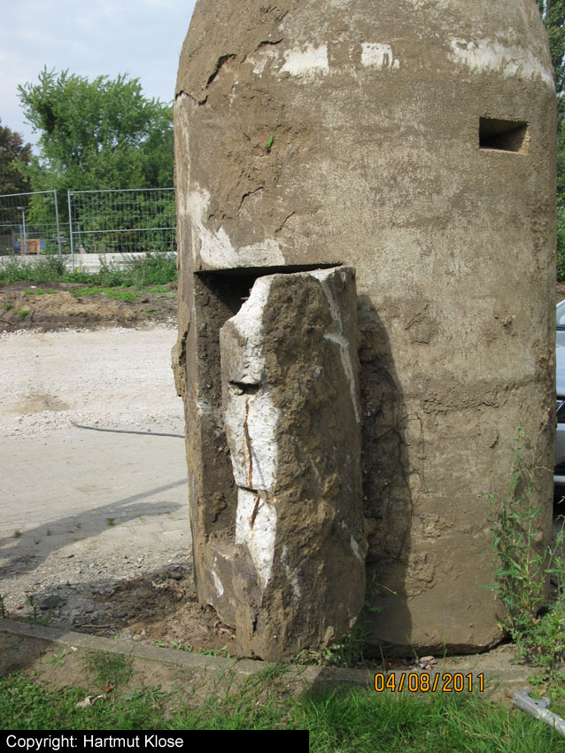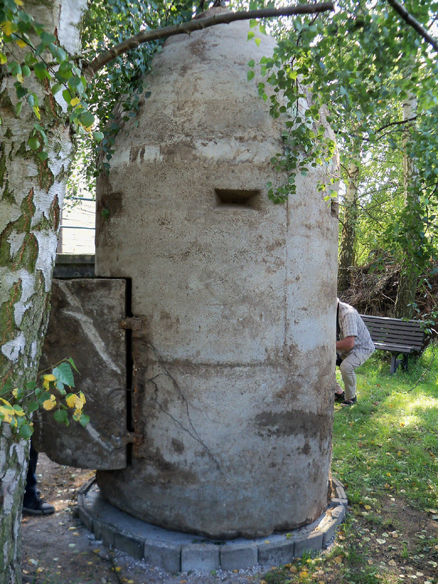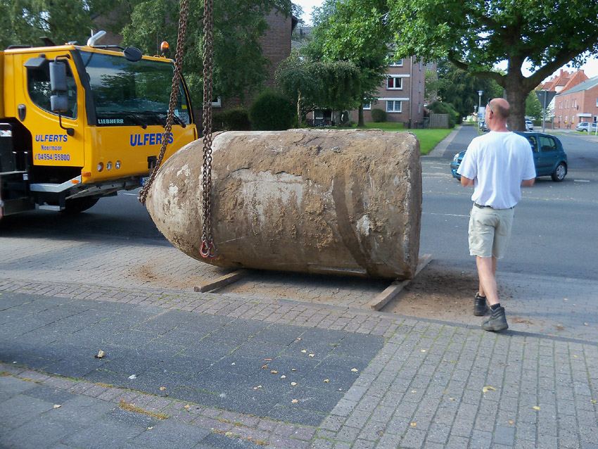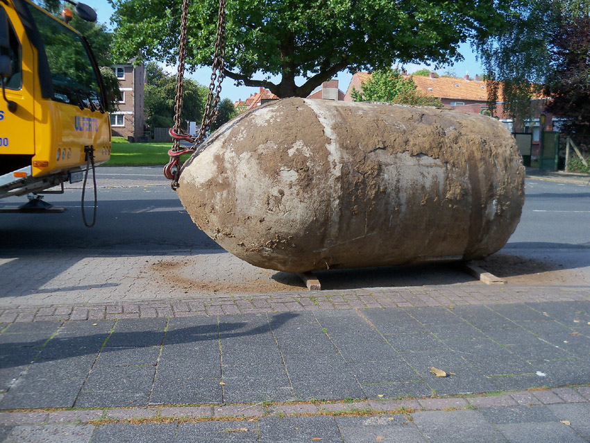 Diese Westermann-Splitterschutzzelle, die im Erdreich bei Bauarbeiten in Wolfsburg gefunden wurde, soll nach Wilhelmshaven umgebettet werden. Es handelt sich hierbei um den großen Zellentyp mit Notausstieg und Typenschild. Meist besaßen diese Zellen einen angesetzten massiven Fundamentsockel, dieses Objekt jedoch nicht.