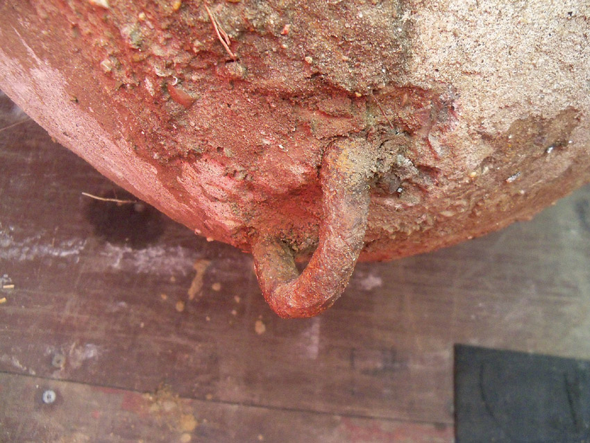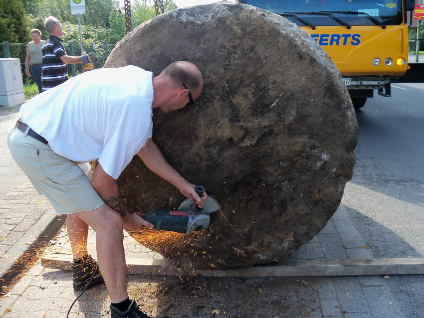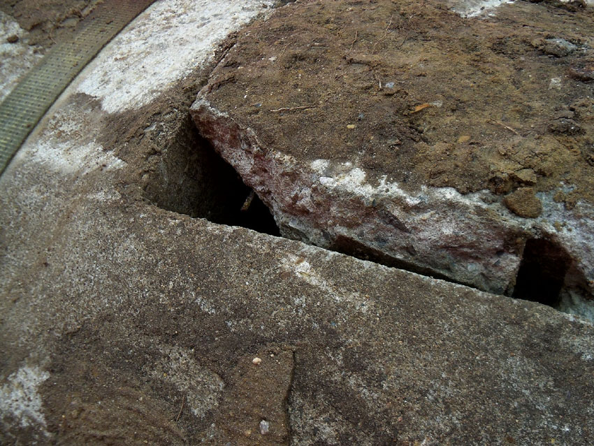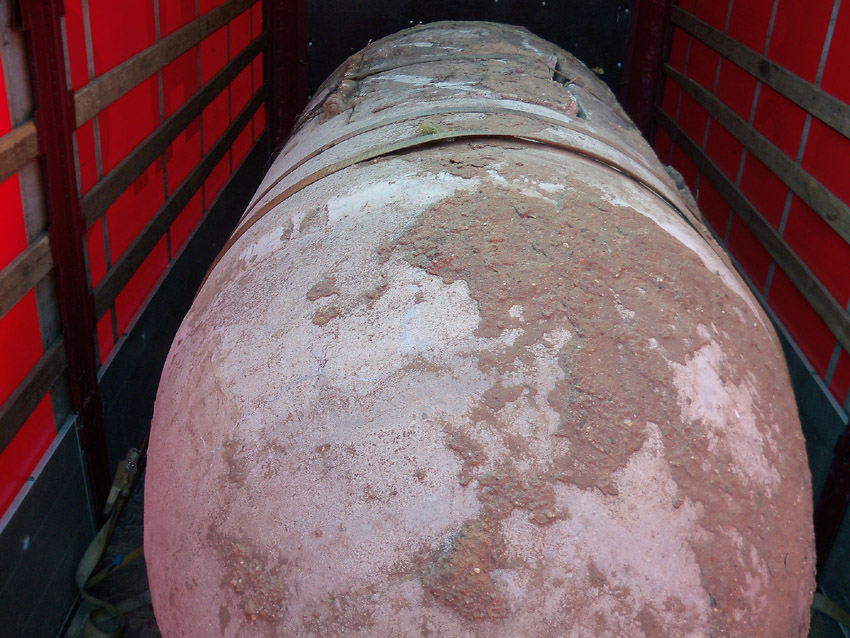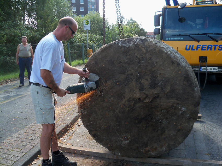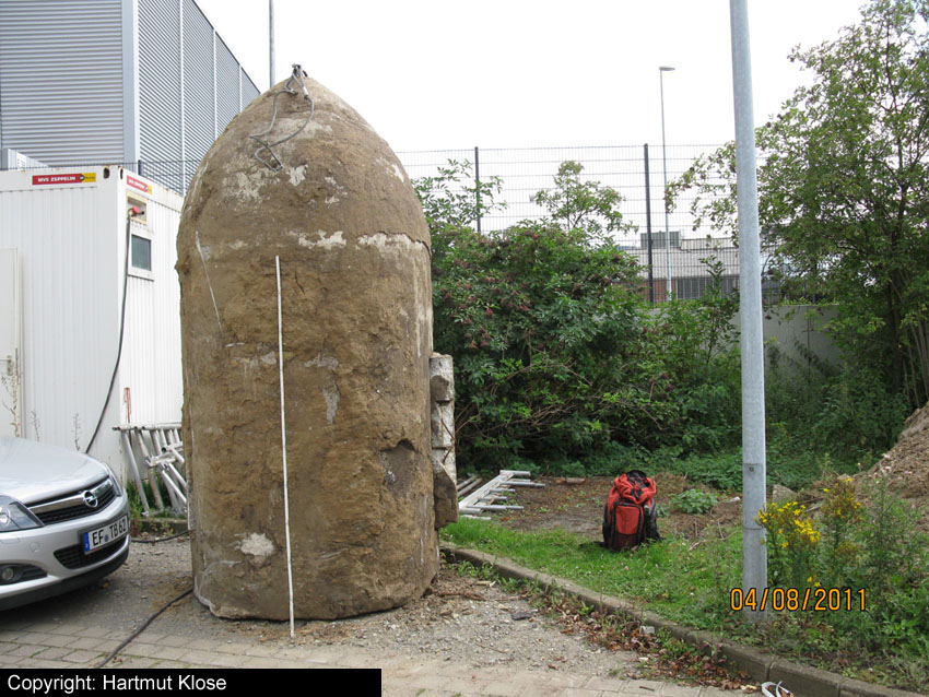Diese Westermann-Splitterschutzzelle, die im Erdreich bei Bauarbeiten in Wolfsburg gefunden wurde, soll nach Wilhelmshaven umgebettet werden. Es handelt sich hierbei um den großen Zellentyp mit Notausstieg und Typenschild. Meist besaßen diese Zellen einen angesetzten massiven Fundamentsockel, dieses Objekt jedoch nicht.