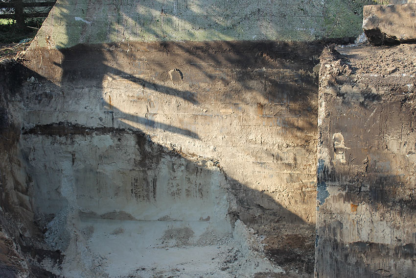 Der um das Bauwerk herum befindliche feine Sand wurde damals während der Errichtung angefahren, um hier eine "Lockerung" des Erdreiches herbeizuführen / Verdämmungseffekt - Druck bei Nahtreffer. Dies ist bei vielen Deckungsgräben derart durchgeführt worden.