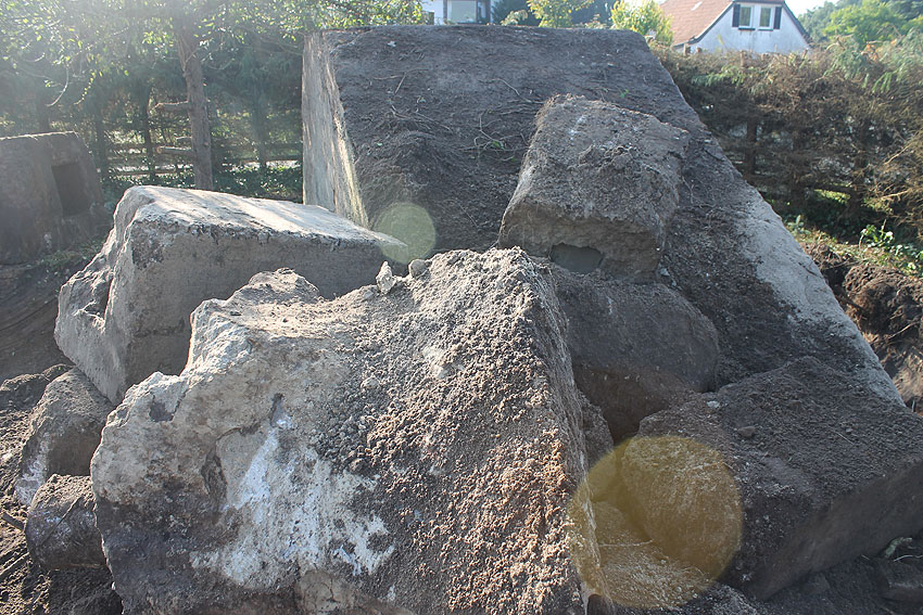 Am 7. und 8. September 2016 wurde nun der betonierte Deckungsgraben an der tom-Brok-Straße Ecke Bahnhofstraße in Schortens / Heidmühle abgerissen. Das Bauwerk konnte beim besten Willen nicht in das geplante Neubauvorhaben (Einfamilienwohnhaus) integriert werden und musste deshalb leider weichen. Der Abbruch erfolgte durch die Firma Swyter GmbH aus Jever. Wir hatten die Gelegenheit, den Abbruch ausführlich zu dokumentieren. Unser herzlicher Dank an den Eigentümer des Grundstückes, Herrn Bruns, für die Ermöglichung!