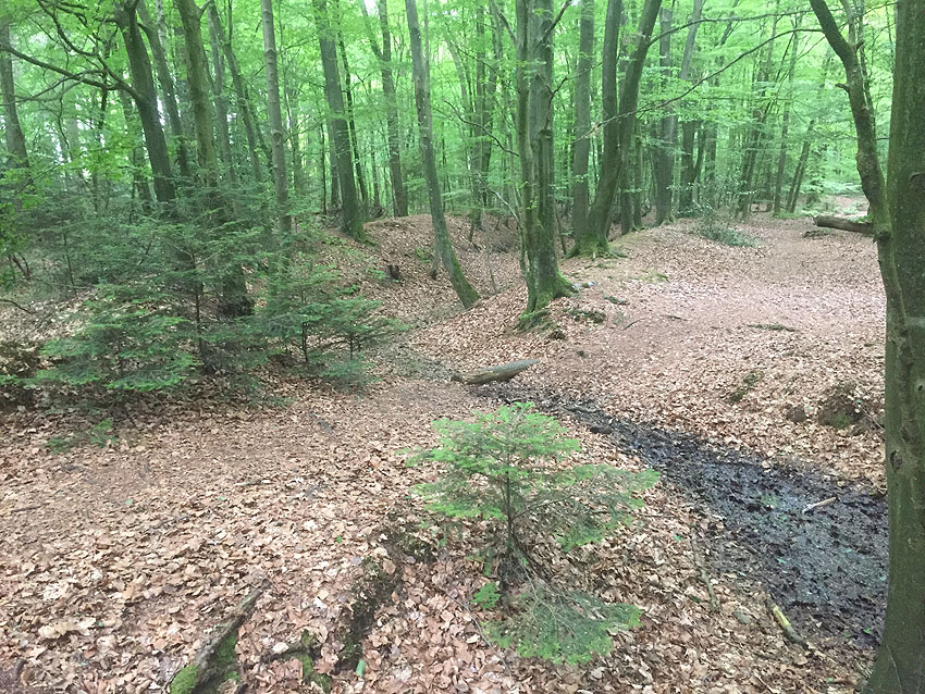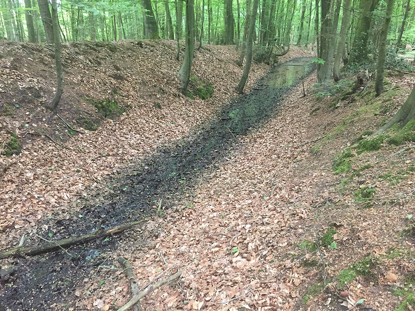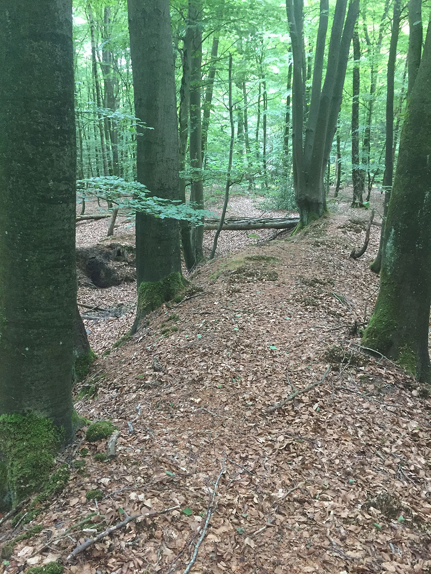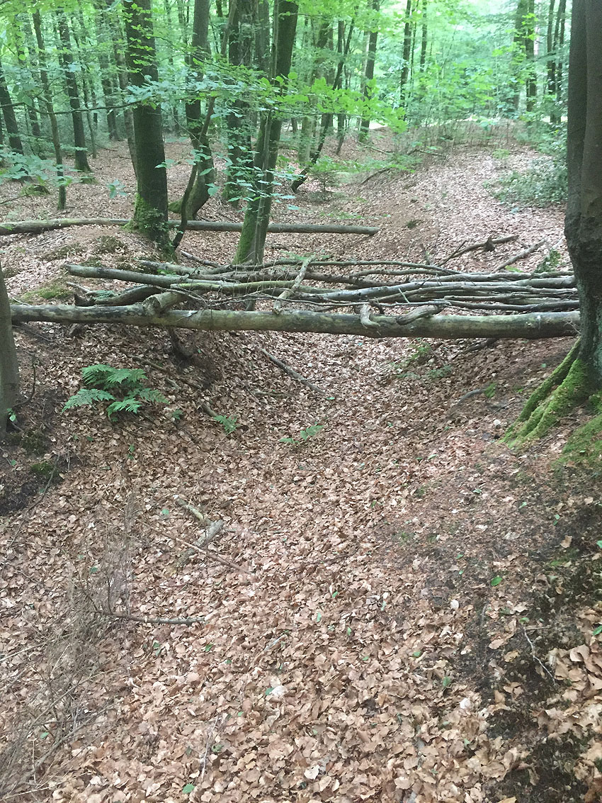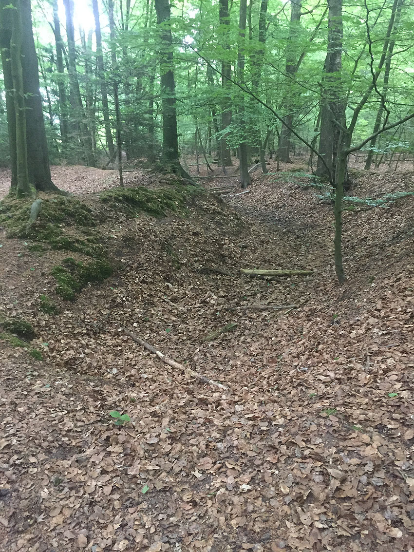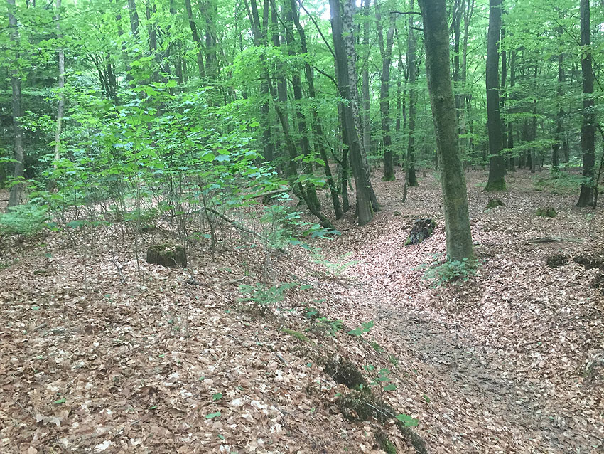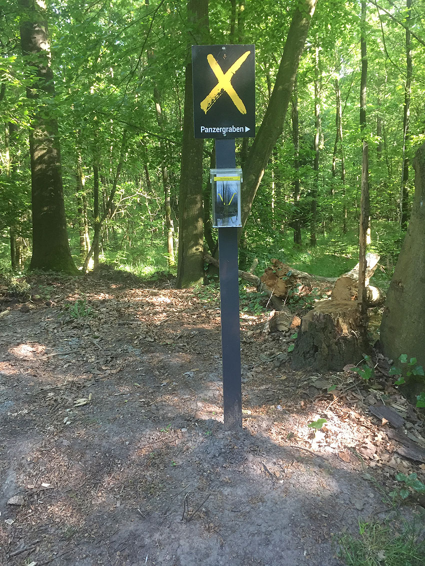 Die letzten Panzergrabenreste mit Gedenkstätte im Sandhorster Wald einige hundert Meter westlich der Bunker. Aufnahmen vom 26. Mai und 9. Juni 2023: