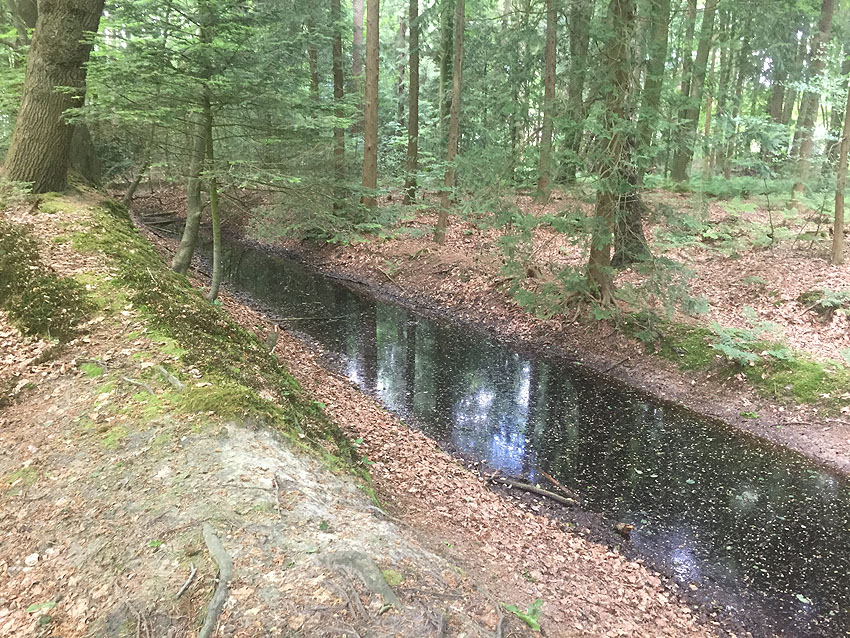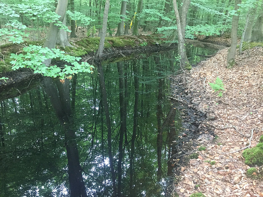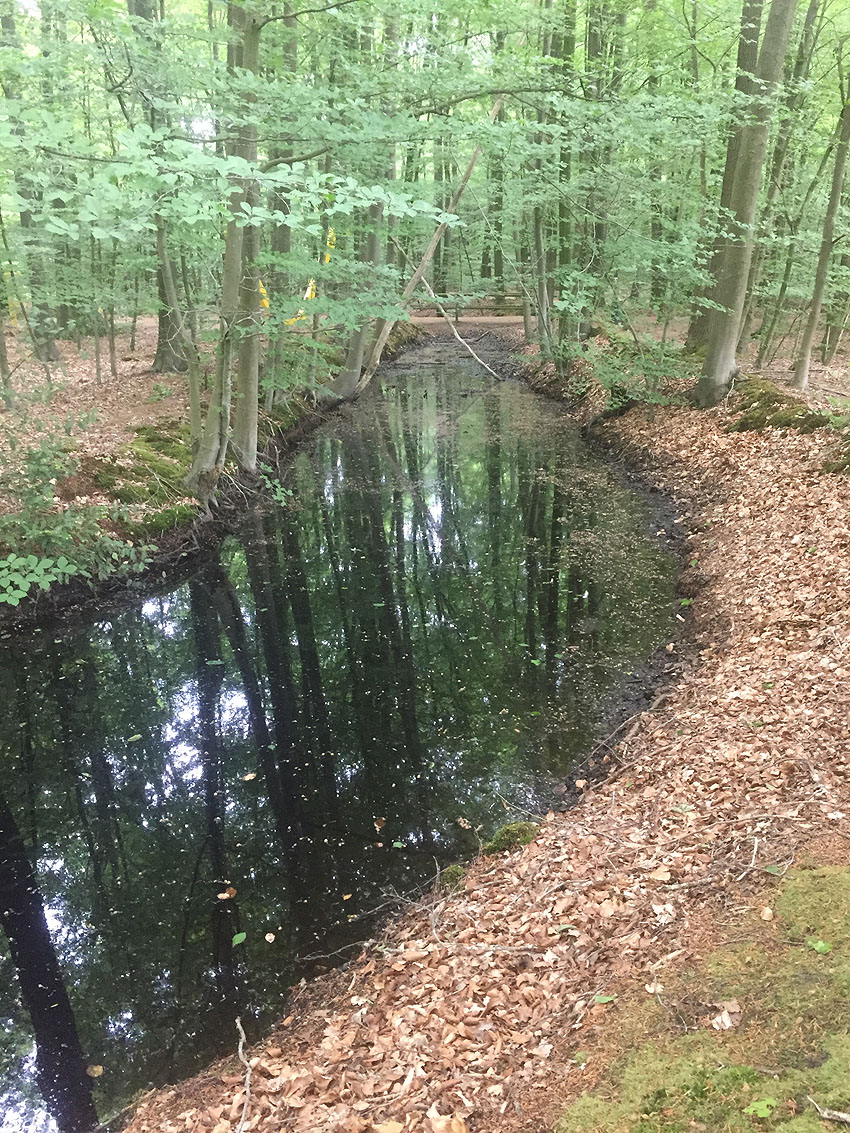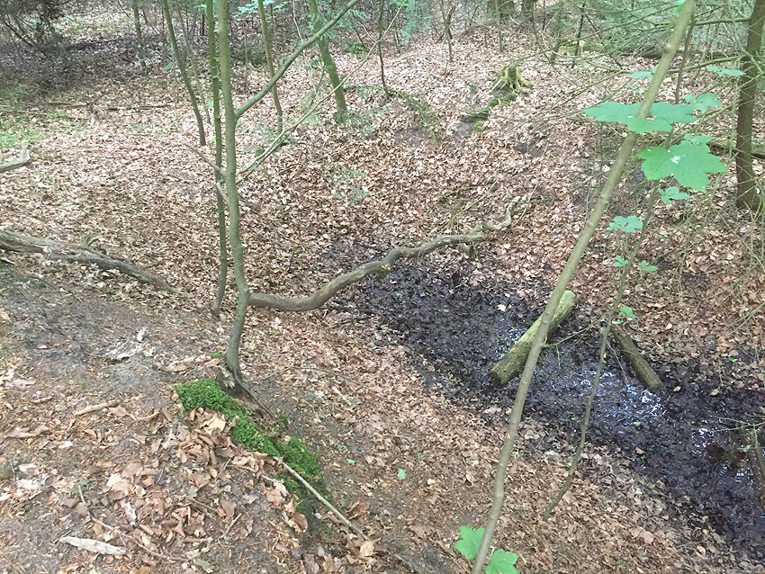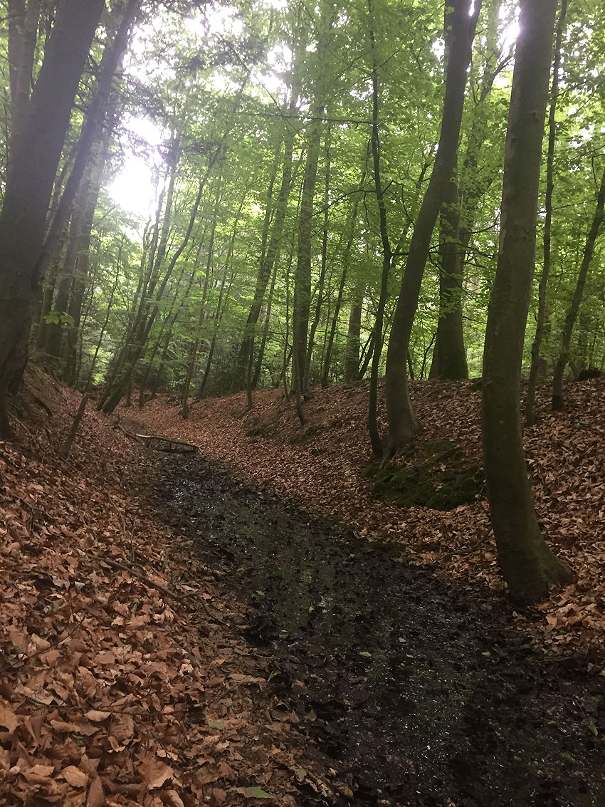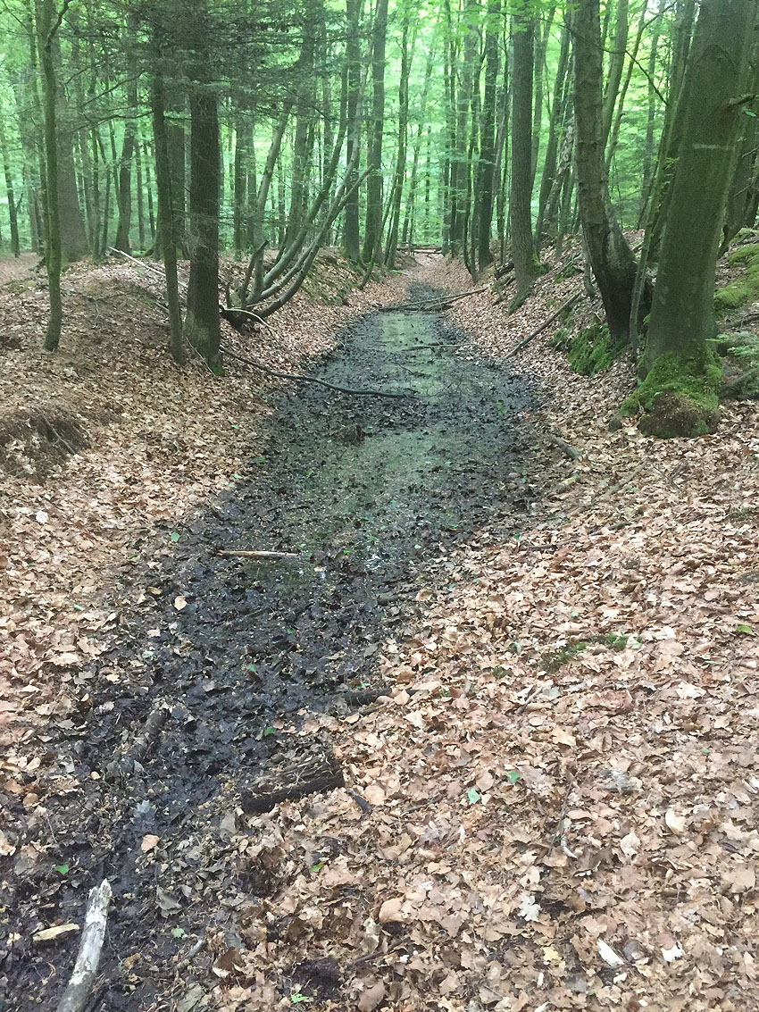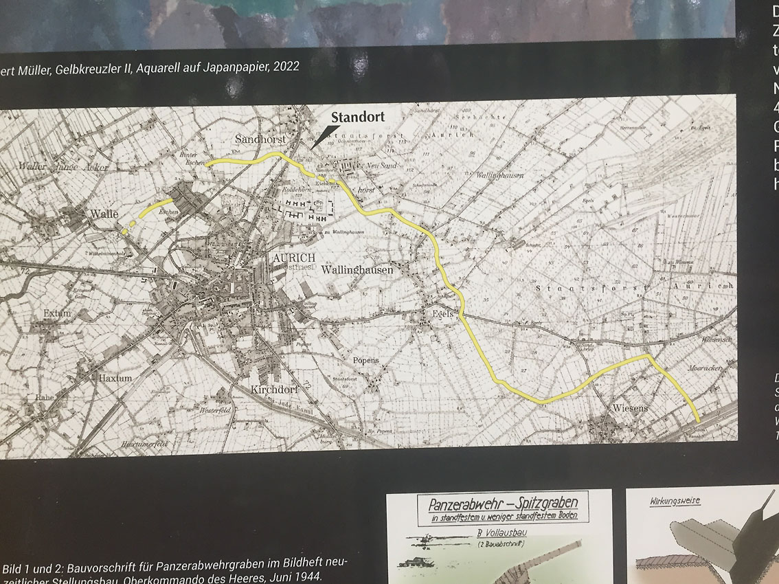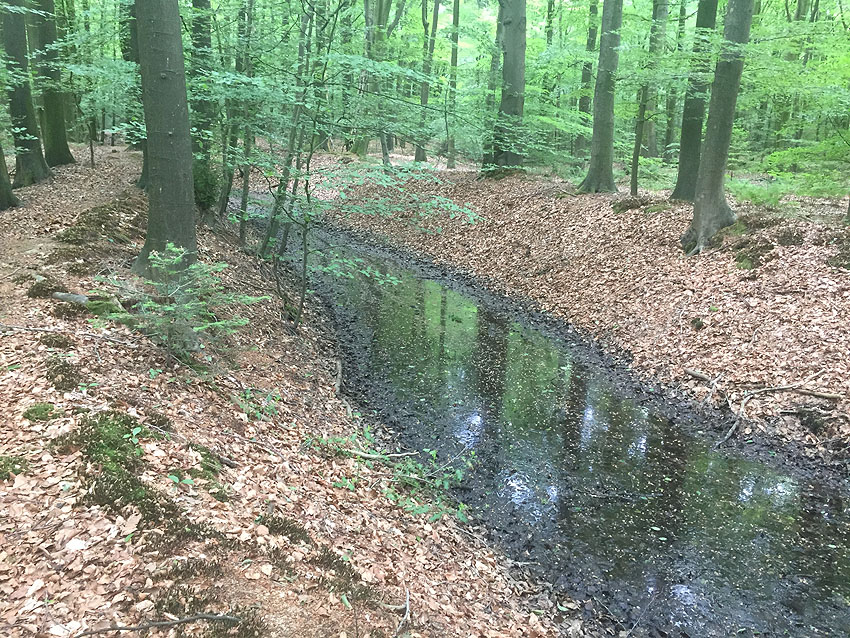 Die letzten Panzergrabenreste mit Gedenkstätte im Sandhorster Wald einige hundert Meter westlich der Bunker. Aufnahmen vom 26. Mai und 9. Juni 2023: