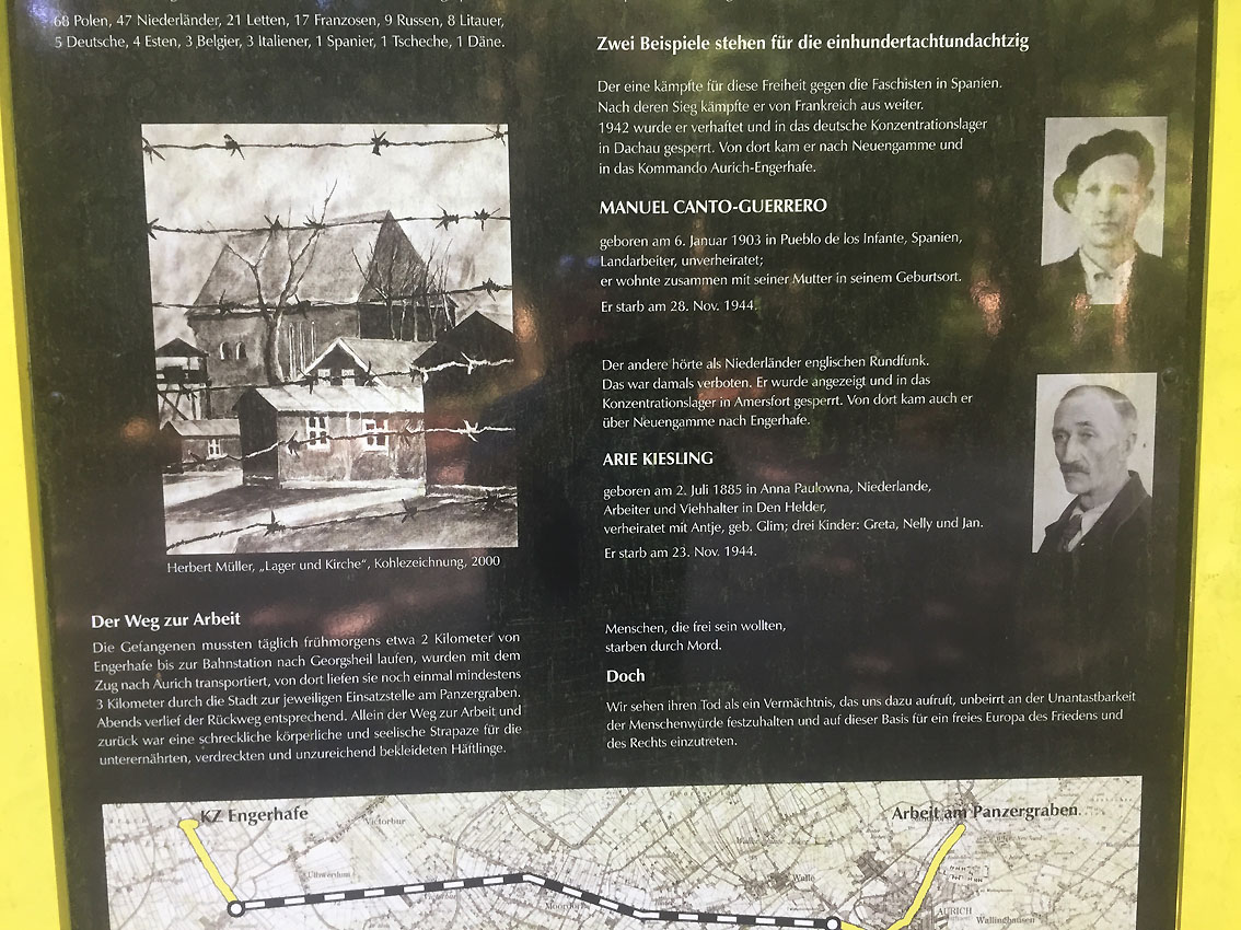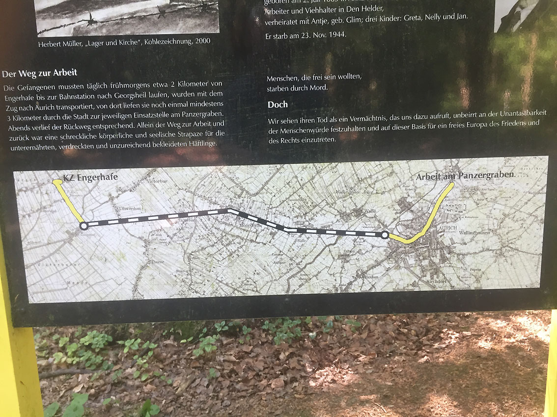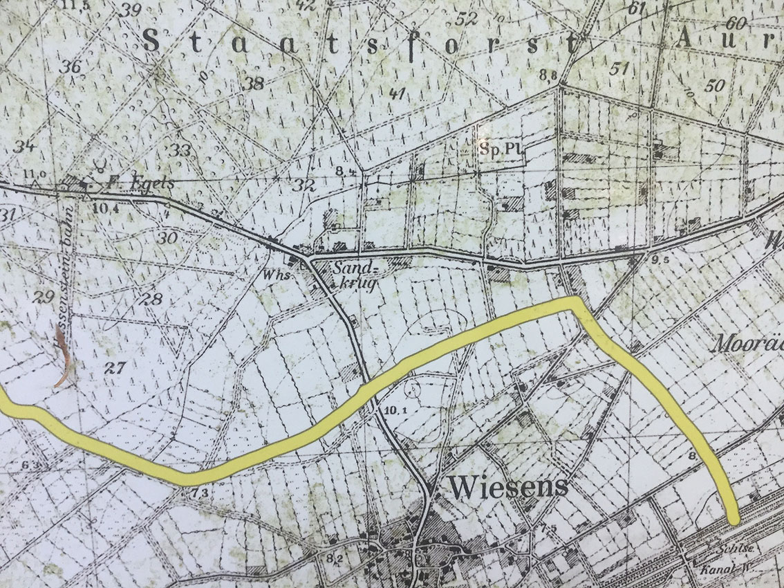 Nachtrag 04.10.10: Die Bunker werden definitiv im Zusammenhang mit dem in den 1970er Jahren entfernten militärischen (wohl Kriegsmarine) Waldkrankenhaus Neu-Sandhorst stehen (oben im Text bereits unter der Überschrift nachgetragen), welches sich im Bereich der neuerlichen Siedlung befand. Aber auch eine Verbindung mit den Bauarbeiten am "Friesenwall" kommt weiterhin in Betracht. Für den Bau des Walls (hier als reiner Panzergraben) zum Schutz der in der Kriegsendphase zur Festung erklärten Stadt Aurich wurden u.a. KZ-Häftlinge aus Engerhafe mit der Bahn hierher beordert: Ein kleiner Bahnhof lag nach Hinweisen unweit nördlich des Bereiches Sandhorst. Tatsache war aber, dass die Häftlinge vom Auricher Bahnhof in der Innenstadt nach Sandhorst (zumindest zunächst) zum Grabenbau zu Fuß marschieren mussten. Auch könnten mindestens die beiden eckigen Bunker für Materiallagerzwecke / Baumaterial für den Panzergraben mitgenutzt worden sein. Hauptzweck war aber hier Schutzraum / und OP-Möglichkeiten während Luftalarm / Luftangriffstätigkeit.