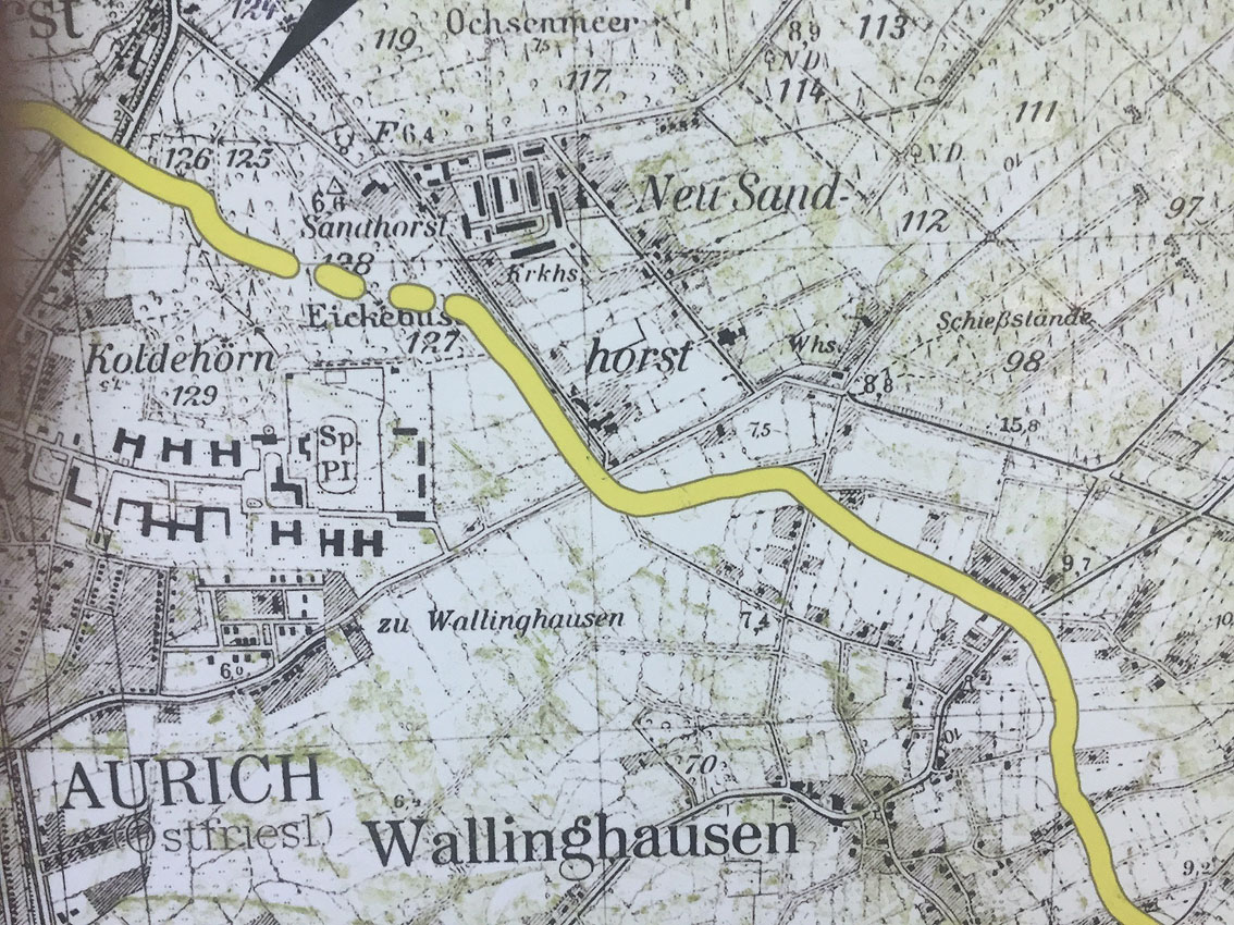 Die folgenden massiven LS-Bunker befinden sich in der Auricher Siedlung Neu-Sandhorst. Im Krieg befand sich hier ein zumeist aus Baracken bestehendes Ausweichkrankenhaus, das großteilig für das Krankenhauswesen der extrem luftgefährdeten Stadt Emden angelegt worden war.