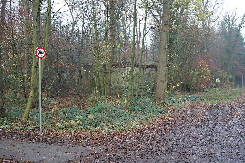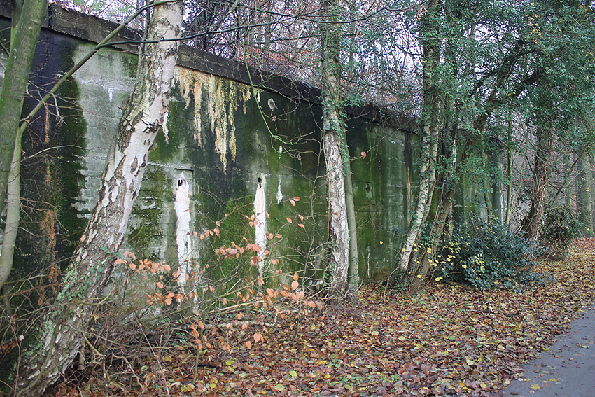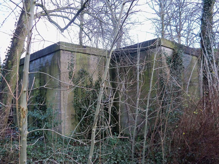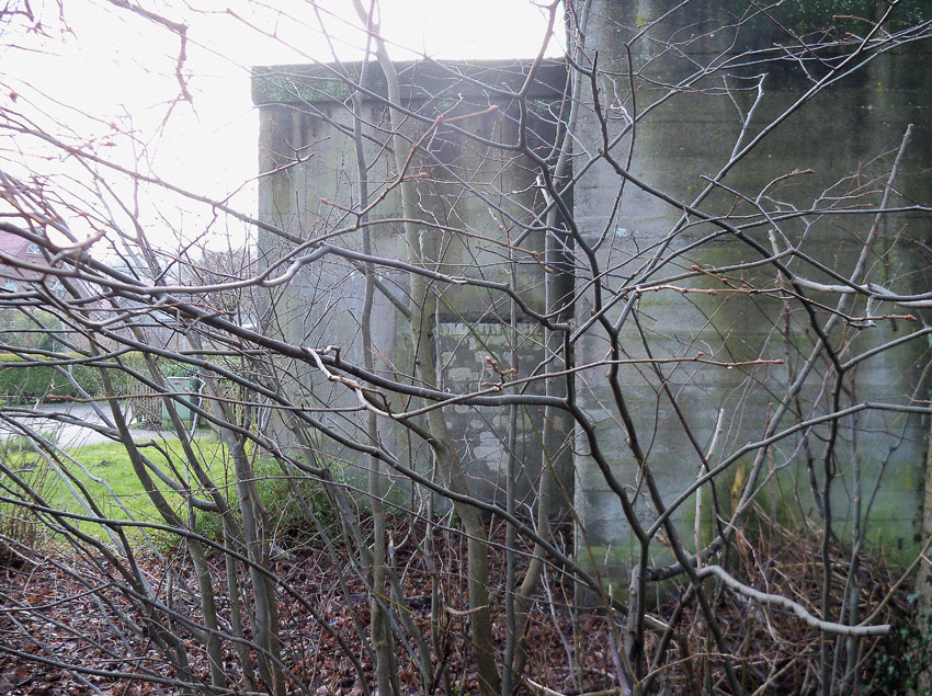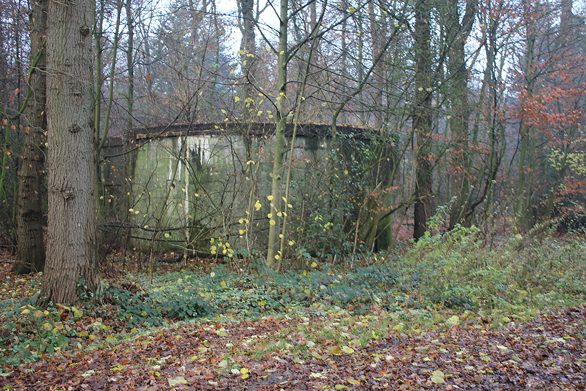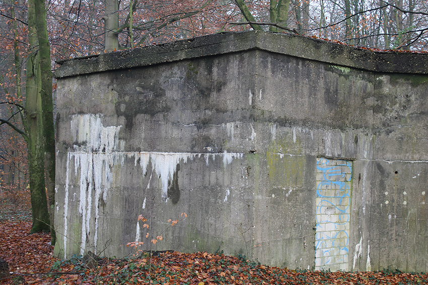Ein rechteckiger, wohl bombensicherer Bunker (Kleinbunker) mit vier Eingängen (fast alle komplett zugemauert)...