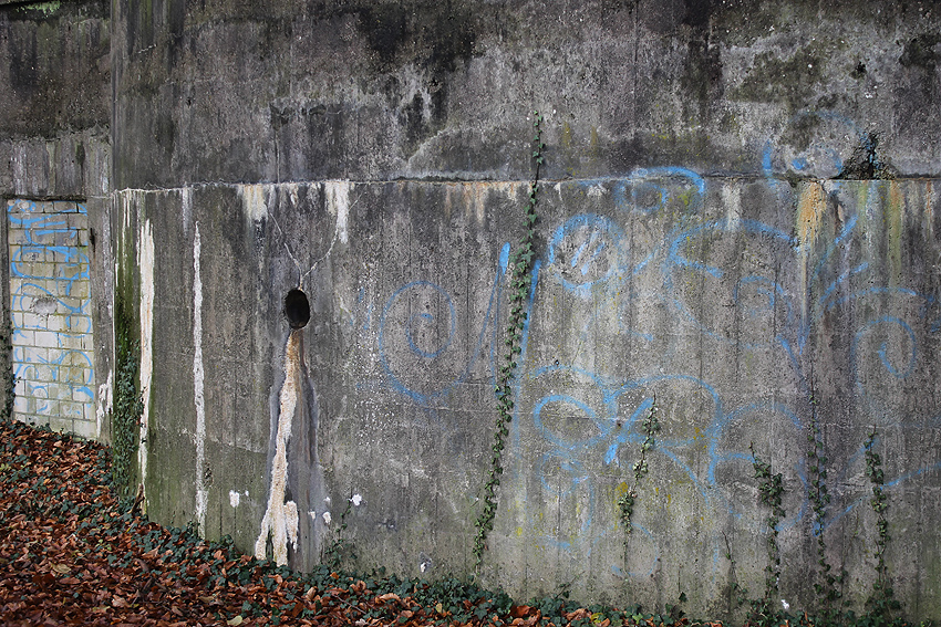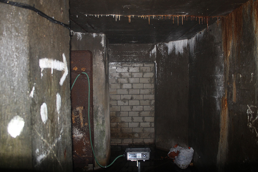 Ein LS-Pfeil zum Eingang wie an den anderen Bunkern wurde ebenfalls angemalt... Der Innenraum wurde nach dem Krieg als Lager für Chemikalien (und Farben) genutzt. Heute ist er vermüllt und in verwahrlostem Zustand...