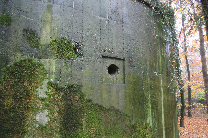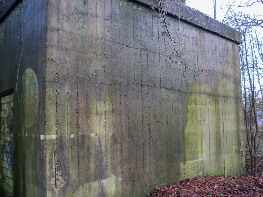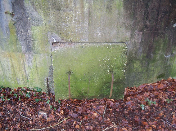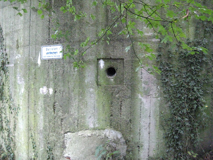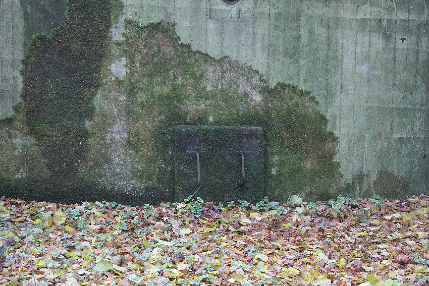 Am hier nicht ersichtlichen rückwärtigen Bereich des Westsplitterschutzvorbaues befindet sich ein heller Kreis, war hier ein ROTES KREUZ (wie am westlichen Rundbunker - Bilder folgend) angemalt?