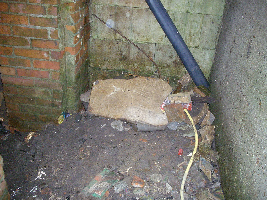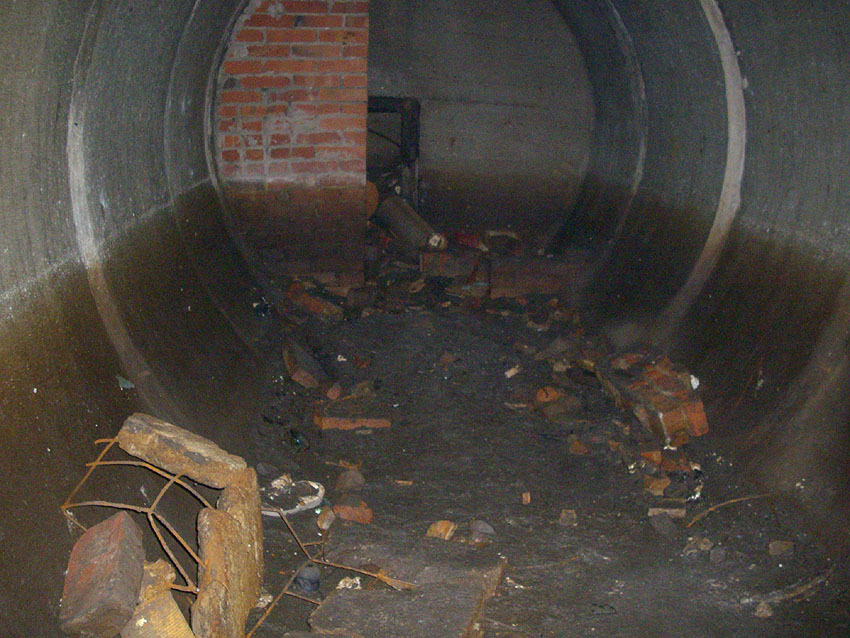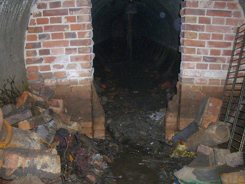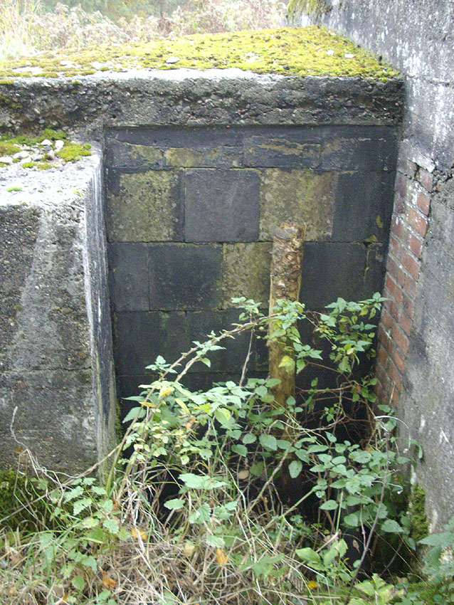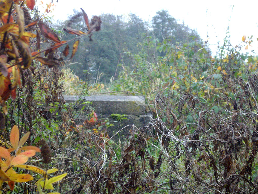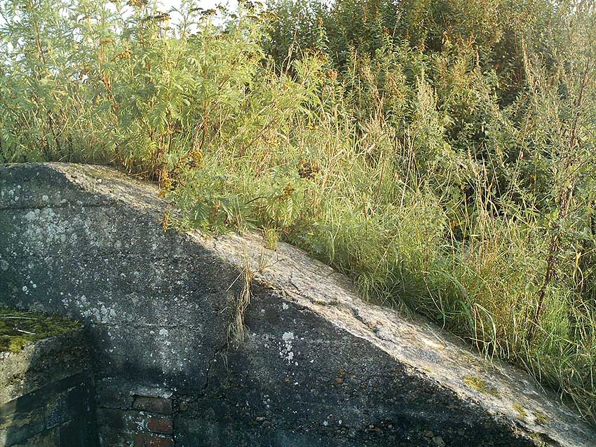 Der Deckungsgraben (im Hintergrund ein circa 50 Meter hoher Ziegelei-Schornstein, kein Lüftungsrohr des Grabens!). Die Ähnlichkeit des Fotos zum Herzbruchstollen Pflegeheim Banter Weg in Wilhelmshaven ist verblüffend: