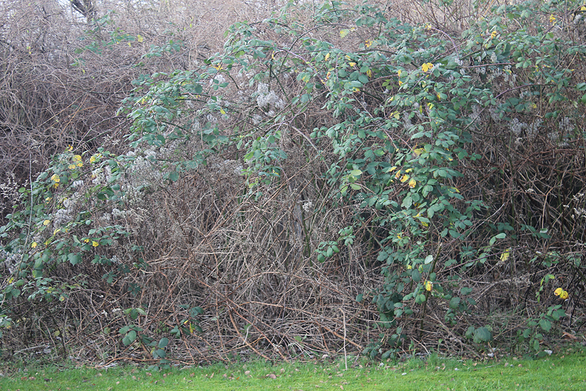 Der Deckungsgraben ist auch in der Winterzeit komplett mit Brombeersträuchern dicht überwachsen. Die Fotos entstanden am 25. Dezember. Ganz wenig ist der Bereich des Osteinganges zu erkennen.
