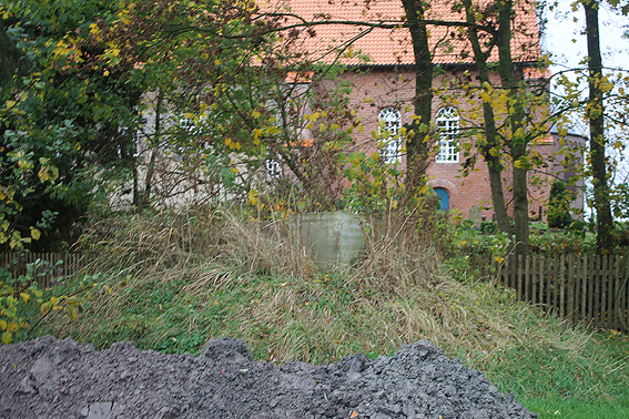 In Langwarden direkt an der Kirche befinden sich diese vier quadratischen Betonsockel. Was hat es damit auf sich? War hier eine Funkanlage im Zusammenhang mit der Flakstellung installiert? Die Stellung selbst lag ein Stück weiter entfernt am Deich.