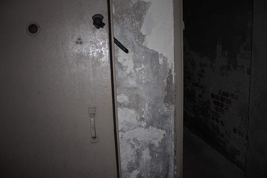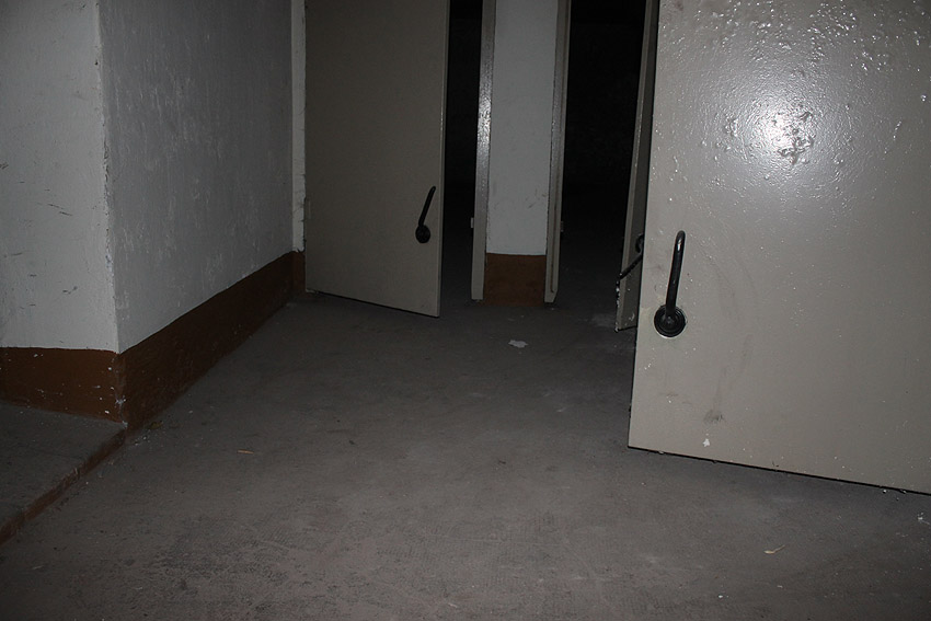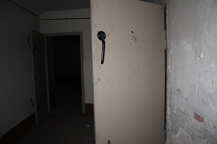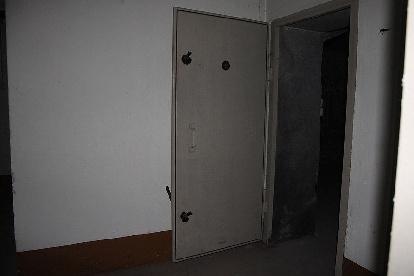 Stand 2024: Im Zuge einer Sanierung des Gebäudes wurden die Luftschutzklappen und die Luftschutztür mittlerweile hellbraun angestrichen.