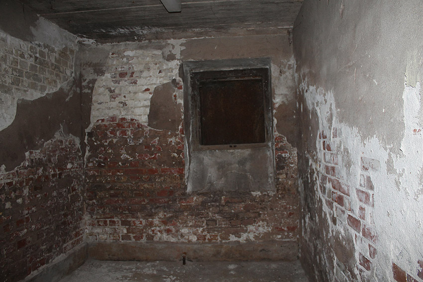 Rechts neben der hinteren Luftschutzklappe ist der teilversenkte Luftschutzkellereingang mit Luftschutztür zu erkennen.