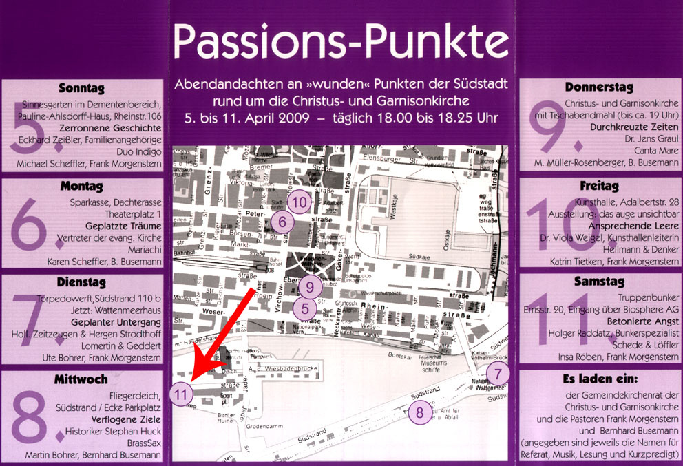 Passions-Punkte 2009 in Wilhelmshaven / 11. April 18 Uhr vorm Truppenmannschaftsbunker 750 2 Emsstraße. Im Rahmen der Passions-Punkte 2009 wird eine kurze Schilderung der Fakten zum Thema "Truppenmannschaftsbunker" erfolgen. Alle Leser sind herzlich eingeladen. Wir berichten hier nach der Veranstaltung. Hier