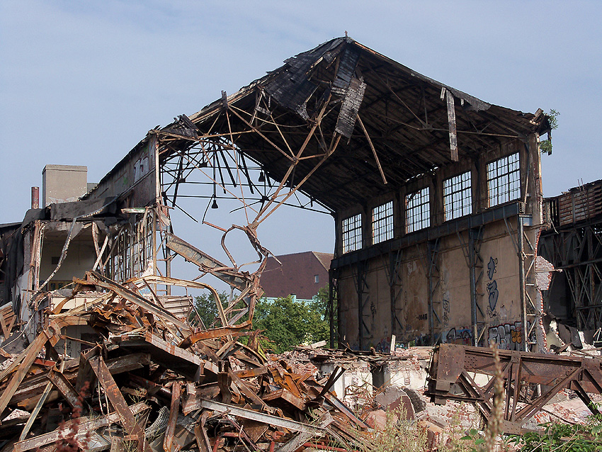 Südzentrale: Heute wurde unter anderem der Rest des Daches der großen Maschinenhalle zerstört. Dies geschah um einige Minuten vor 16 Uhr. Das charakteristische Erscheinungsbild der Südzentrale ist nunmehr endgültig Vergangenheit... Hier Heute in der Tagespresse: Südzentrale bald Geschichte