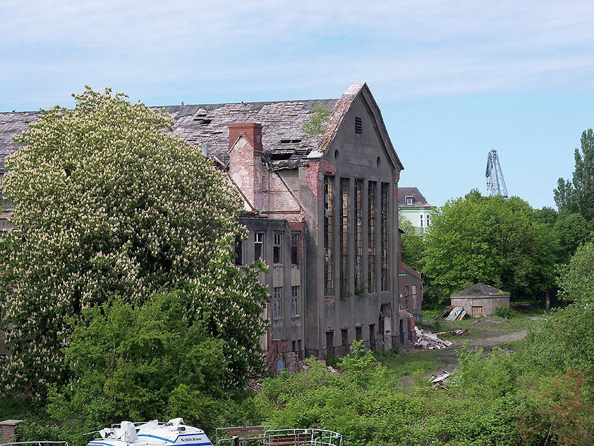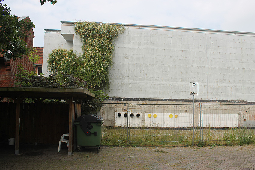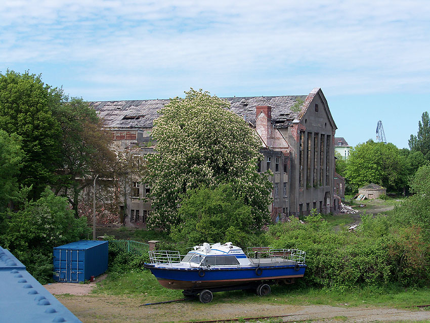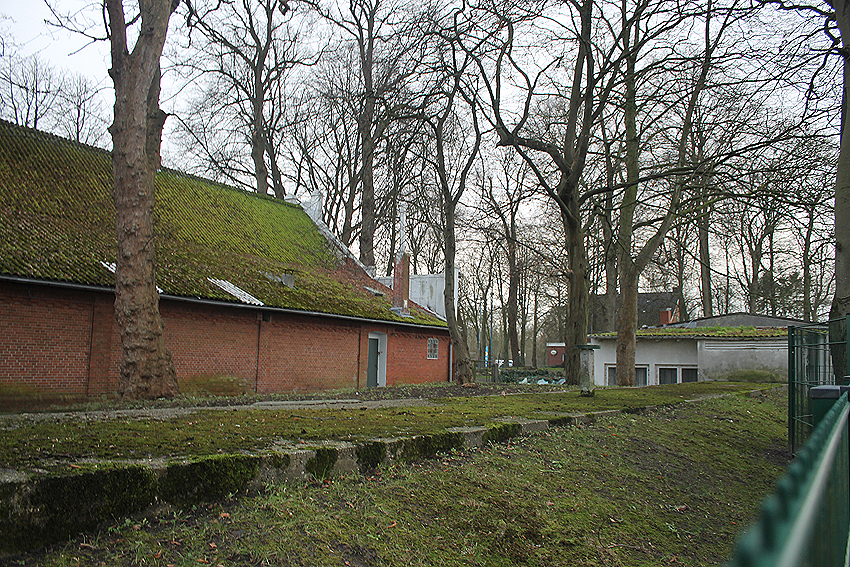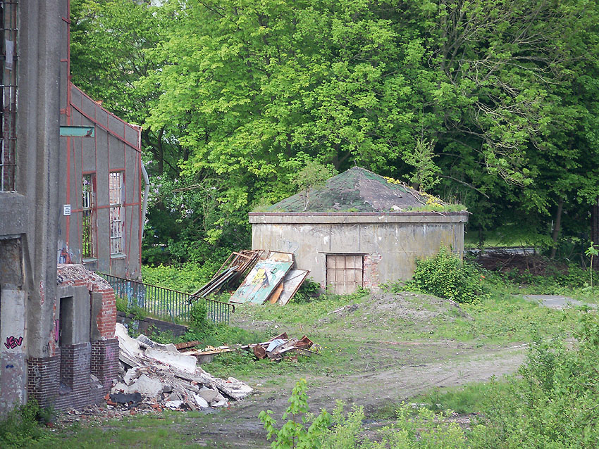 Virchowstraße: So sieht es heute auf dem Bunker aus. Mittlerweile ist der Überbau zweigeschossig... Hier Deichstraße / damaliges Marine-Materiallager: Der Abriss des kleinen Bunkers auf dem Gelände, das zuletzt von HBV genutzt wurde, ist noch immer nicht weitergeführt worden. Dies hängt damit zusammen, dass er die Nachkriegshalle darüber stützt. Ein Stahlträger wurde hierzu seinerzeit beim Hallenbau in das Bunkerdach eingebracht. Der Kleinbunker dürfte daher als letztes abgerissen werden. Hier