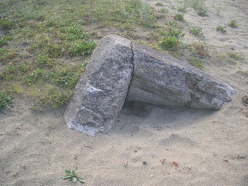 Ehemalige schwere Flakstellung Tirpitzhafen: Am 4. Juni 2015 besuchten wir nochmals den überschütteten Bereich vom Geschützbunker Südwest. Was wir fanden, war nicht "Nichts", allerdings nur sehr wenig, darunter jedoch ein Treppenrest (auf den Geschützbunker?). Hier Klein Wangerooge: Der alte Tank Süd-Mitte wird nun Schritt für Schritt mit schwerem Gerät wohl vollständig weggemeißelt. Am Boden des Tanks sind Rohrleitungen erkennbar und ein Ölgeruch durchzieht den Abrissbereich. Erkennbar ist die Massivbauweise des Bodens und der Wände aus Stahlbeton. Weiter westlich scheint die Sanierungsmaßnahme an der Landzunge Klein Wangerooge West beendet. Die Betonkanalrohrteile, die seinerzeit für Freizeitzwecke dort aufgestellt wurden und bis kürzlich neben der Baustelle lagerten, sind verschwunden. Hier