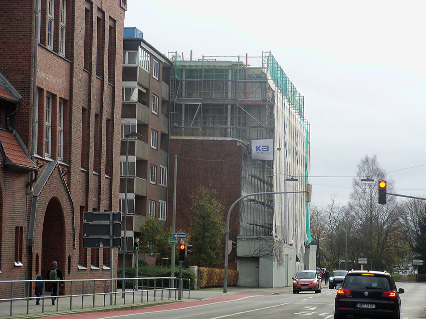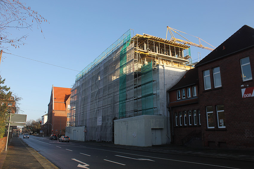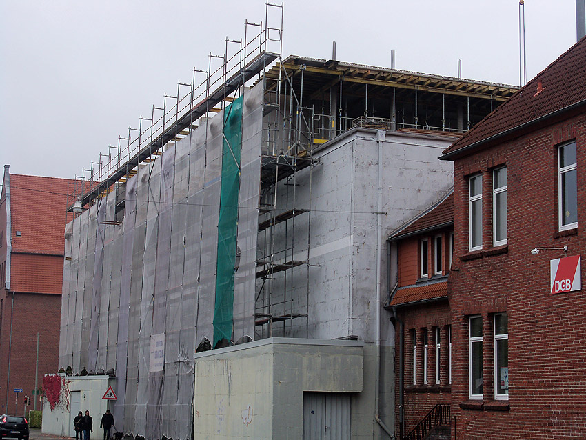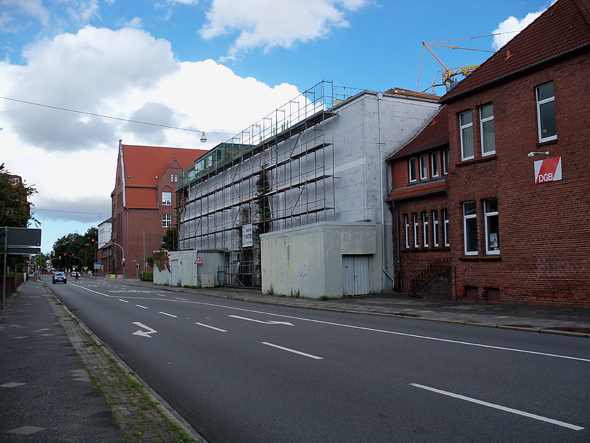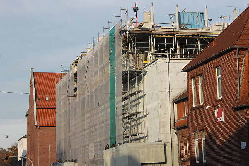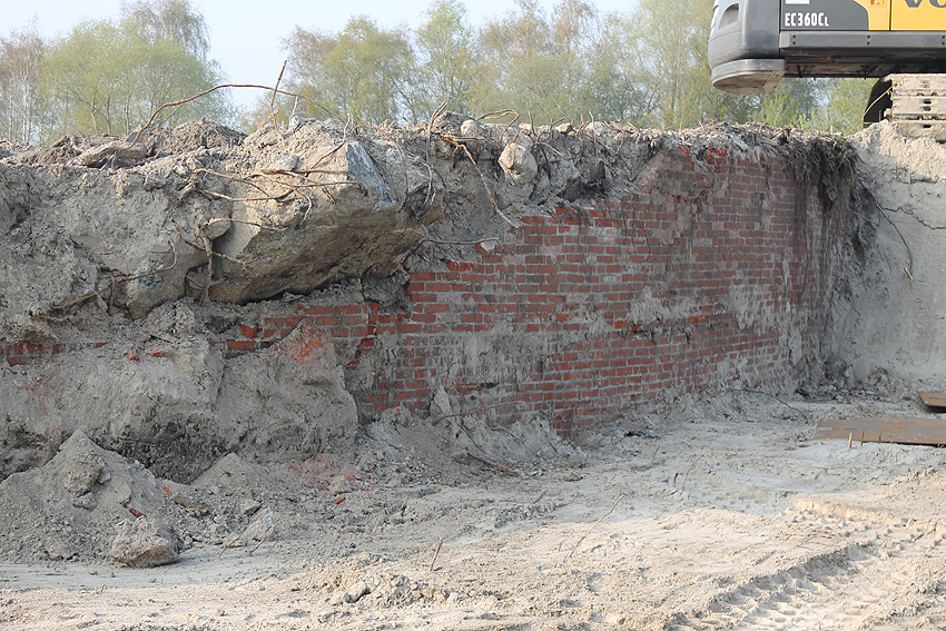 Am Deckungsgraben der ehemaligen Schule Neuende wird nun "gegraben". Vor dem alten, bereits umgebauten Schulgebäude entsteht Neubebauung. Der betonierte Deckungsgraben wird unangetastet bleiben. Hier