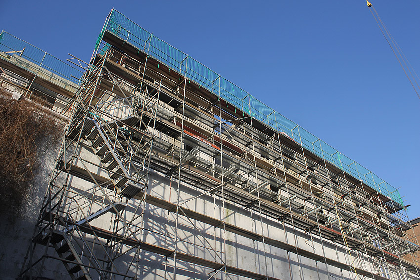Bunker Virchowstraße - Es geht los: Die Arbeiten zur Umgestaltung des ehemaligen OP-Bunkers haben nun begonnen. Gerüste wurden an beiden Längsseiten des Bunkers aufgebaut. Ein hoher Baukran steht nun vor Ort. Auf dem Dach befindet sich bereits Baumaterial. Hier