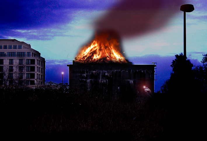Obwohl in unserem lieblichen Städtchen ja (fast) alles denkbar ist, findet das Osterfeuer am Banter See entgegen der gestrigen Meldung nicht auf dem Bunker statt, sondern einige Meter weiter westlich. Zumindest Ostern 2015 bleiben wir also von einem solchen Anblick verschont. Zu riechen sein dürfte das Feuerchen am Samstag eventuell dennoch bis nach Bremerhaven. Auch die Fans schwedischer Saunen müssen sich leider umorientieren: Die Saunaparty im Bunker fällt aus. Wir bitten unsere gestern teilweise irritierten Leser, uns diesen kleinen Aprilscherz nicht übel zu nehmen. Etwas Humor muss sein. Humor, den wir uns öfter in der Stadt wünschen... Unser spezieller Dank geht an Klaus, der uns gestern vor Ort vom Bunker aus anrief und feststellte, dass sich keine Osterfeuervorbereitungen auf dem Bunkerdach abspielten. Er mutmaßte aber, nachdem er in Richtung Osterfeuerhaufen einige Meter westlich blickte, dass das gesamte Strauchwerk aufgrund des aktuell tobenden schweren Sturmes in einem Stück vom Dach geweht sein könnte. Und dass es sich weiter westlich - im krassen Gegensatz zu Murphys Gesetz - im Ganzen und fein säuberlich gehäuft auf der dortigen Wiese niedergelegt haben könnte. Wir danken für diese feinsinnige gedankliche Kreativität. Solch wache Geister brauchen wir öfter in der Stadt. Besuchen Sie am Samstag das Osterfeuer "Banter See-Park" nahe des Bunkers. Schauen Sie sich die dezente, weiche und warme Beleuchtung des Bunkers durch das Feuer an. Durch solche Veranstaltungen vor Ort - wie vor einigen Tagen auch das "Licht-Graffiti" - projiziert ans Bauwerk - wird der Bunker in der breiten Gesellschaft immer mehr ein akzeptierter Bestandteil der Gesellschaft und rückt weg vom so oder so unsinnigen Schimpfbegriff "Schandfleck". Wir wünschen allen Lesern ein schönes Osterfest.