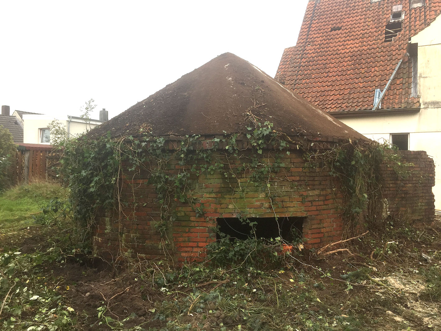 Abgerissen wurde nun in der Woche vom 9. Oktober bis 13. Oktober 2023 das historische Wohnhaus Poststraße 17 in Fedderwarden bis auf ein Nebengebäude. Der vormals komplett umwachsene kleine Rundschutzbau auf dem Grundstück blieb dabei im freigelegten Zustand erhalten. Er ist in erstaunlich gutem Zustand und durchaus massiv ausgeführt worden. Die Entfestigungs- bzw. Aufbruchsöffnung ist der Bereich des ehemaligen Notausstieges, der lediglich erweitert wurde. Vielen Dank für die freundliche Begehungserlaubnis! Es ist wünschenswert, dass der Rundschutzbau dauerhaft erhalten bleibt. Wir berichten weiter.