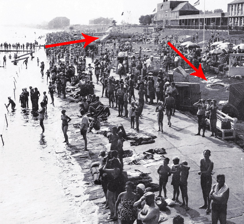 Unsere Meldung vom 1. April 2023: Der Südstrand war in der Tat übersehen mit Ringständen / Friesentonnen und auch ein Bunker / wohl Regelbau an der Strandhalle ist nachgewiesen. Dazu besteht Verdacht auf einen weiteren Bunker / bzw. Regelbau mittig zwischen den beiden Teehäusern am Südstrand unweit östlich vom damaligen "Schwalbennest". Diverse Spliterschutzzellen befanden sich zudem im dortigen Deichbereich, wie auch mindestens zwei Schartenstände zwischen Strandhalle und dem ehemaligen Planschbeckenbereich. Verdacht besteht auf weitere Bauten der Art nach Westen hin... Einen Bunker / Regelbau inmitten hunderter Badegäste und einen zugeschütteten Tobrukstand / Friesentonne nebst Badedecke am Deichfuß wird es jedoch in der Form zu der Zeit der Bildaufnahme nicht (mehr...) gegeben haben. Die interessierten Leser mögen uns den diesjährigen Aprilscherz daher bitte nicht übel nehmen.