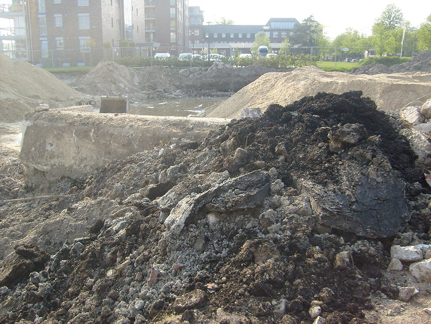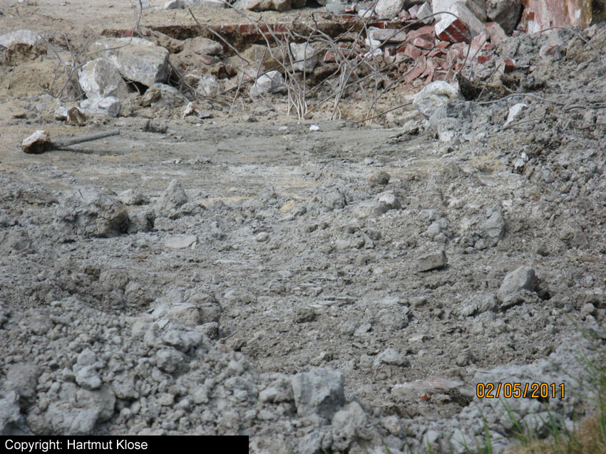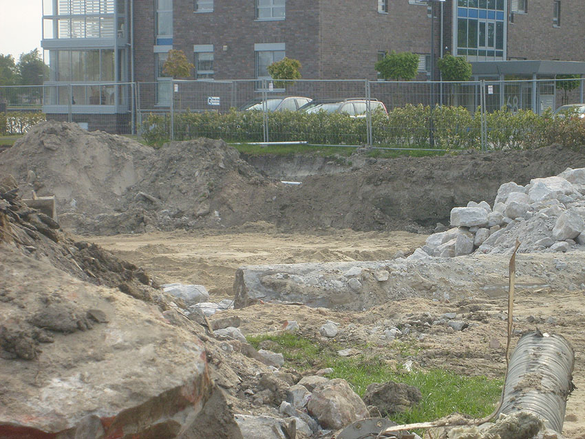 Erste Aktivitäten auf der Baustelle, das Erdreich südlich des Fundamentes wurde mit etwa einem Meter Tiefe entfernt und auf dem Fundament abgelagert. Diverse Rohre und andere Metallgegenstände, Relikte aus der Vergangenheit, wurden unter Erdgleiche aufgefunden. Ein leicht öliger Geruch ist am Gelände wahrzunehmen.