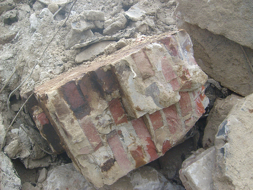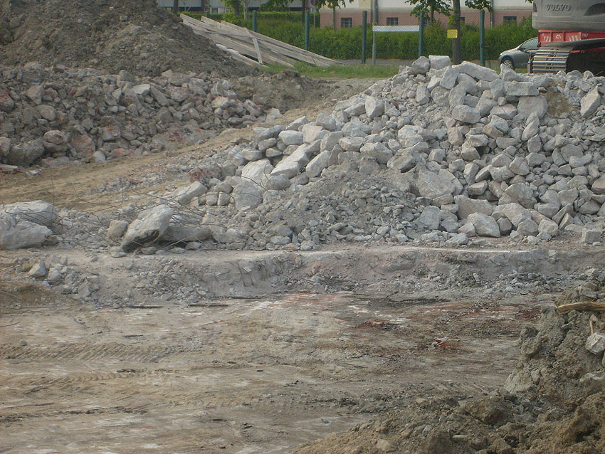 Weitere Abbrucharbeiten am Fundament. Teilweise ist bereits die untere Betonplatte des Ringfundamentes ersichtlich. Darunter wiederum schließen sich die Gründungsholzpfähle an.