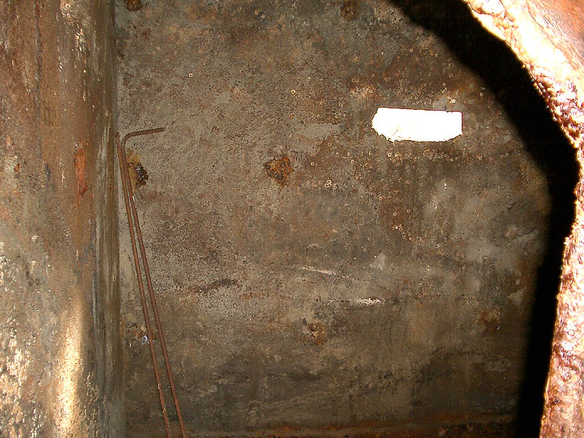 Wir vermuten, dass der Splitterschutzunterstand zusammen mit den Splitterschutzzellen, welche meist auf der Bauwerft standen, aus einer Produktionsserie stammt. Die Form der Türen ist identisch. Auch wird der Unterstand ursprünglich eine Hervorhebung des Metallkäfigs für die Stahltür gehabt haben (siehe Foto Zelle). Diese Hervorhebung wurde mit der Tür nachträglich beim Herausschweissen einiger Stahlkäfigbereiche entfernt. Es könnte auch sein, dass Stahlblenden im Verbund mit dem Käfig, wie bei den Splitterschutzzellen, im Sichtschartenbereich vorhanden waren.
