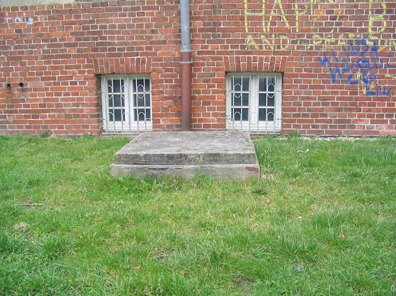 Nachtrag 2021: Bei einem Blick unter den zeitweilig etwas zur Seite geschobenen "Deckel" sind mehrere Steigeisen, die in dem darunter liegenden Schacht (wohl) an dessem gebäudeseitiger Wand entlang führen, zu sehen...