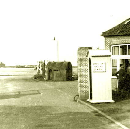 Transportabler Splitterschutzunterstand am Eingang der Banter Kaserne / Banter Ruine. Unmittelbar rechts steht der Truppenmannschaftsbunker 750 1 Emsstraße ("Banter Ruine"). Das Foto stammt aus dem Juli 1946.
