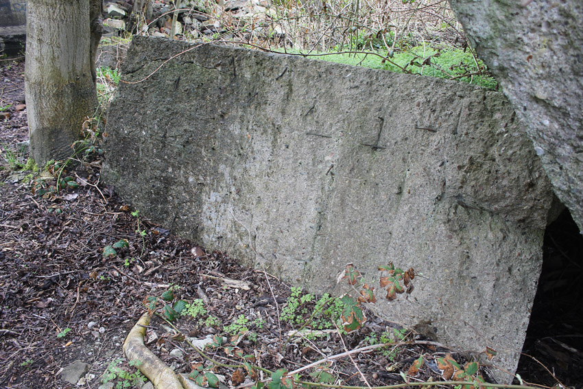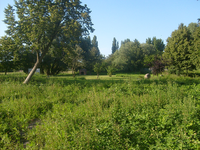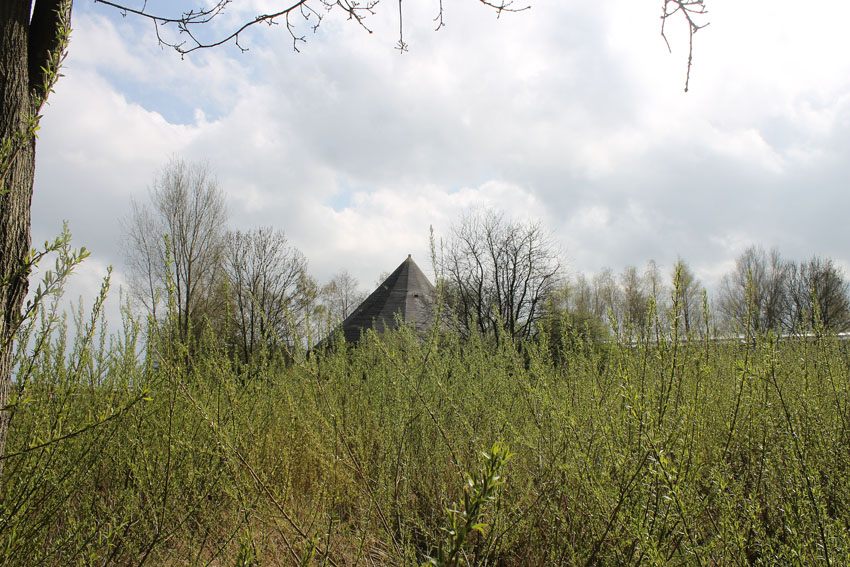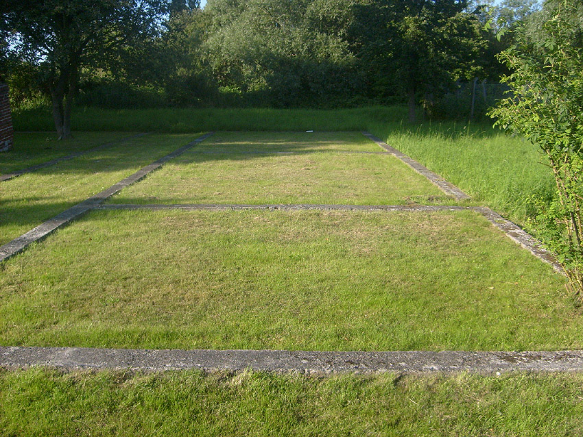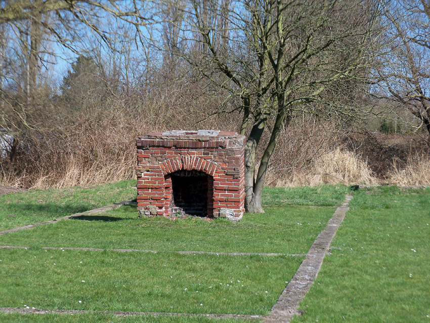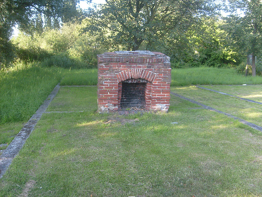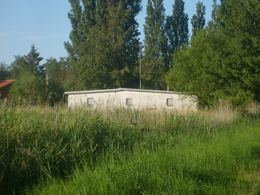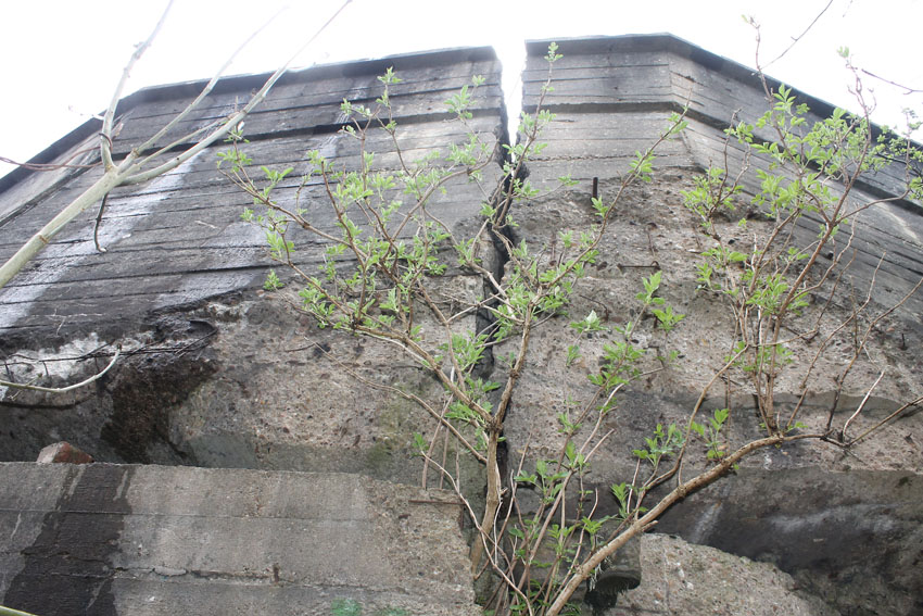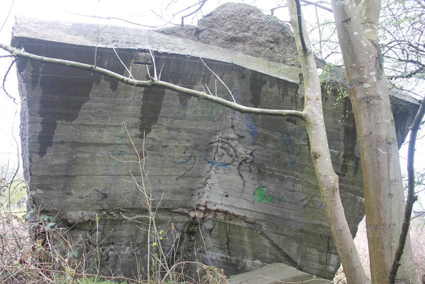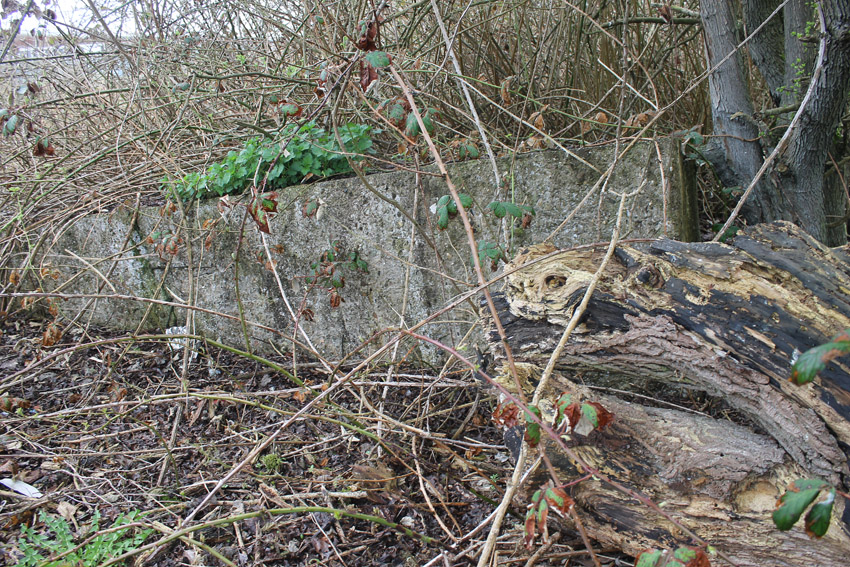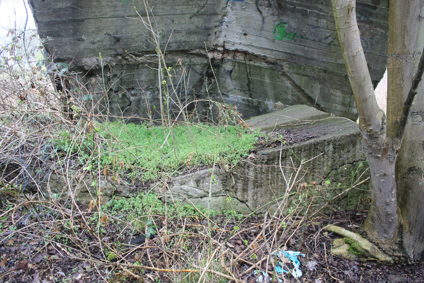 Unter dem zweiten Pfeil von links die Kuppel des gesprengten Turmes. Die Reste der (Rund)Türme 3 und 4 waren hier bereits scheinbar großteilig entfernt (größerer Bildausschnitt nach links hin liegt vor). Dies dürfte damit zusammenhängen, dass diese spärlicher bewehrt waren und die Trümmer somit leichter beseitigt werden konnten. Auch die Sprengung selbst dürfte diese Türme in kleinere Trümmer zerborsten haben, als die anderen Exemplare im Banter Lager.