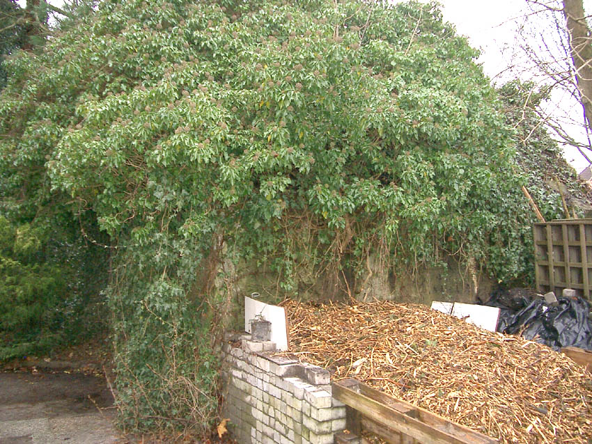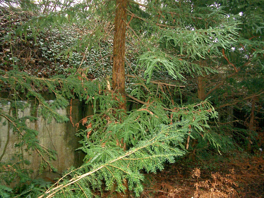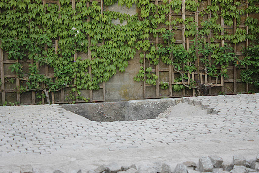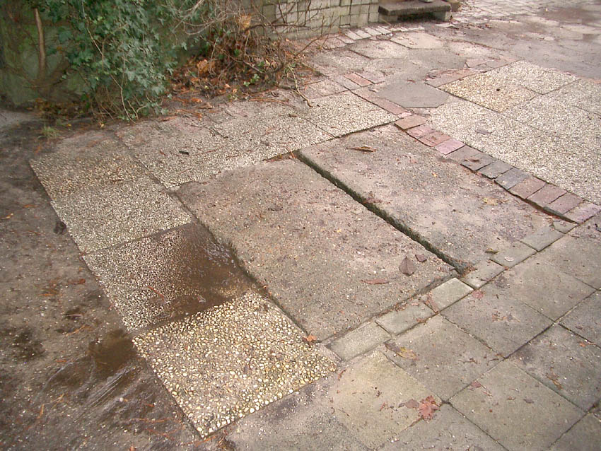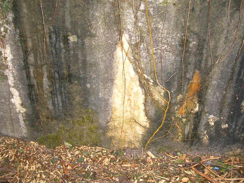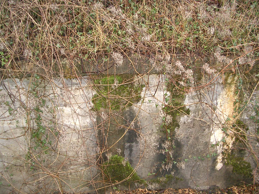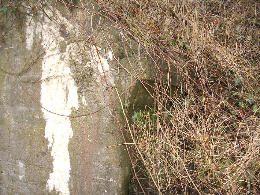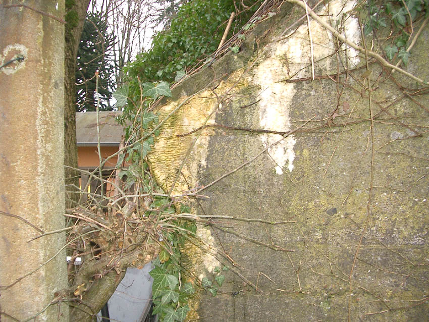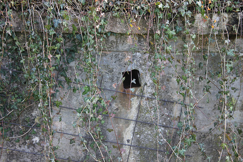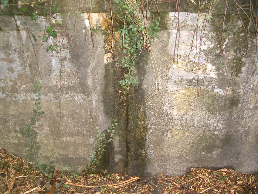 Dieser Deckungsgraben scheint aus zwei Bauelementen zu bestehen. Hier zu sehen ist die Trennungskante. Vielleicht hat diese Tatsache etwas mit den Erschütterungen bei Nahtreffern und der Länge des Bauwerkes zu tun. Hierdurch könnten Brüche im Beton als Pufferzone vermieden worden sein. Theoretisch müssten dann alle betonierten Deckungsgräben der Stadt diese Trennungsstellen aufweisen.